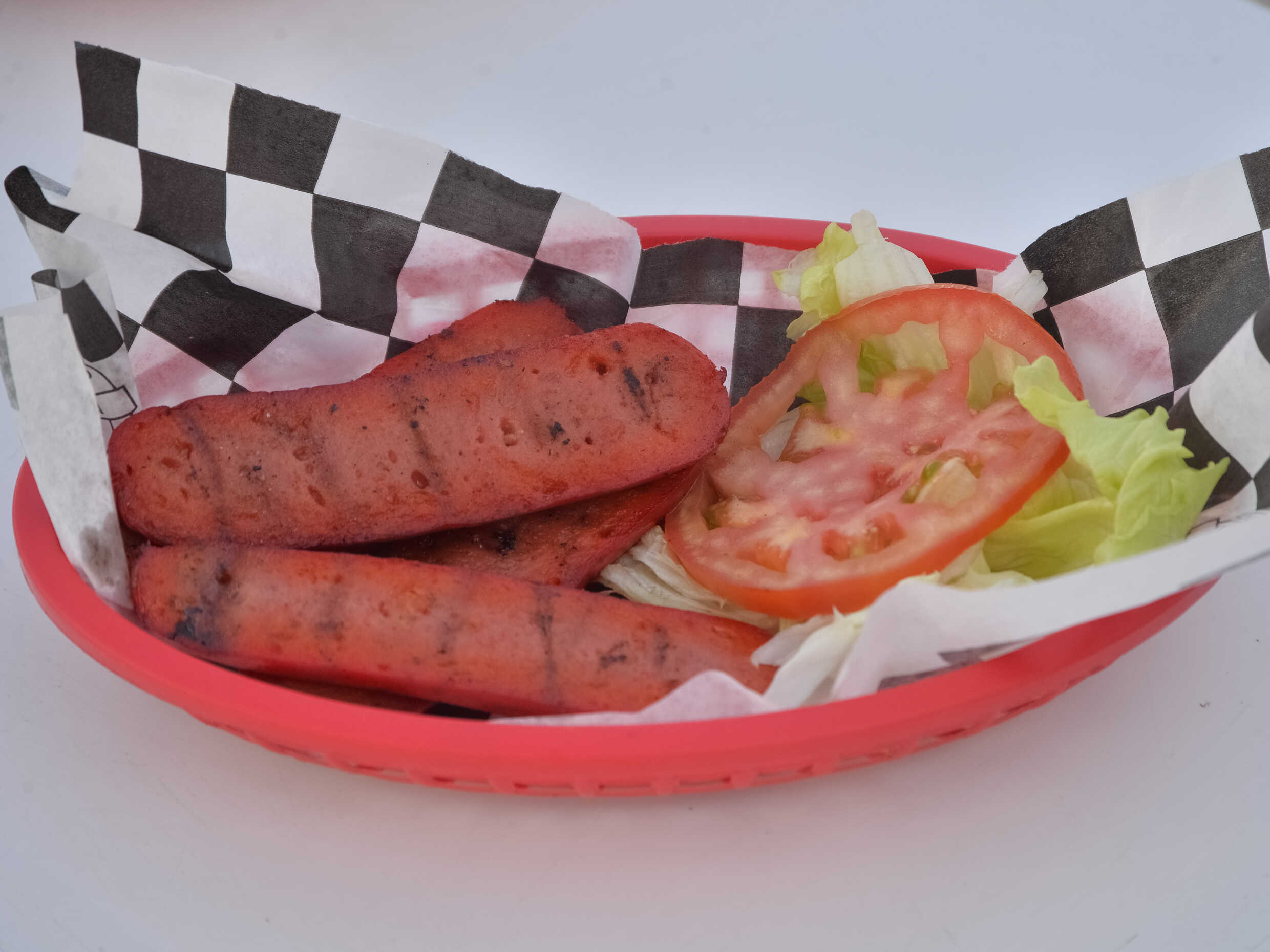 Orden de salchichas para asar, 4 mitades, acompañada de ensalada y tortillas.