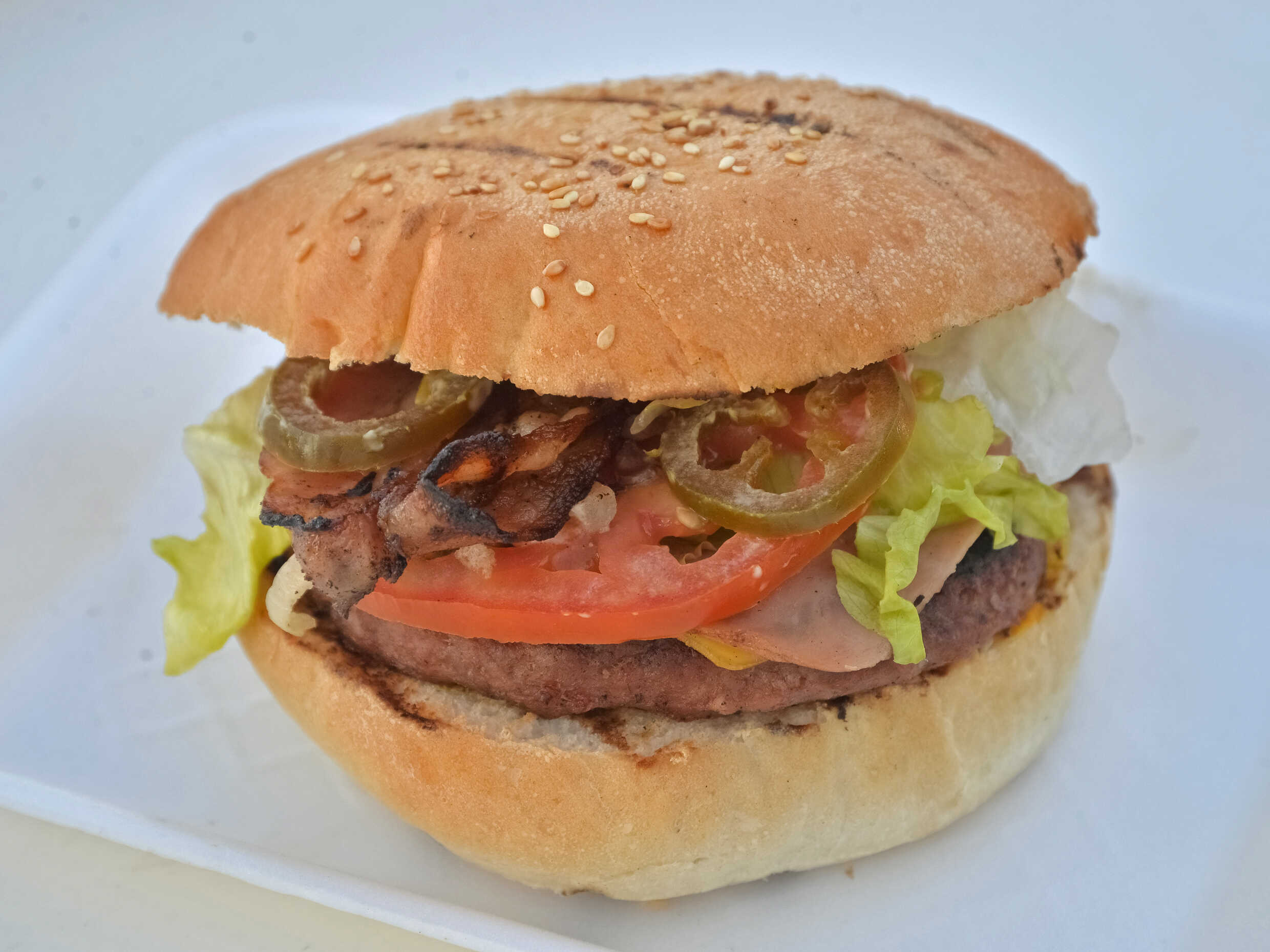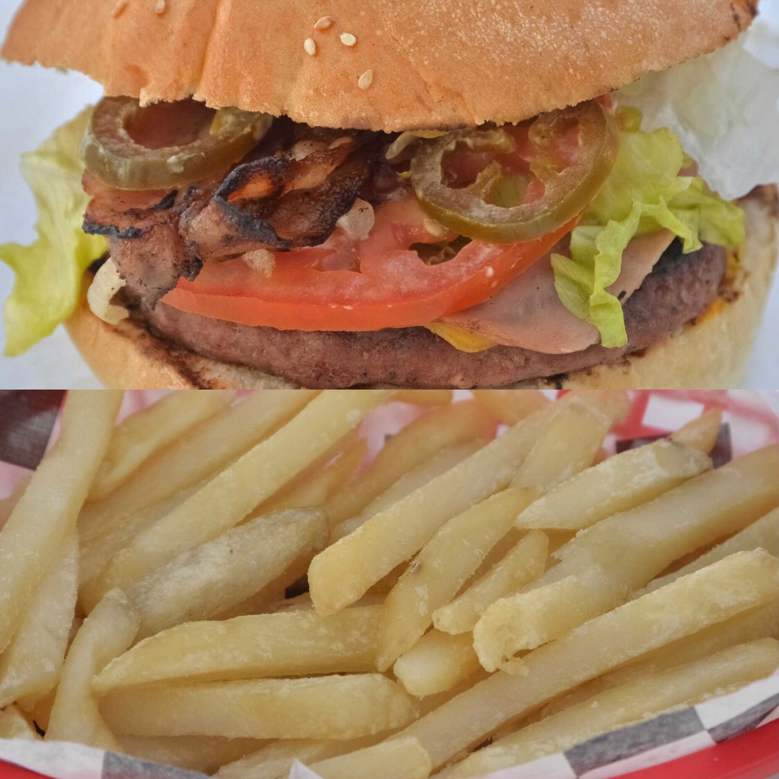 Doble carne, queso amarillo, jamón, tocino, aderezos, verdura, cebolla guisada con tocino.