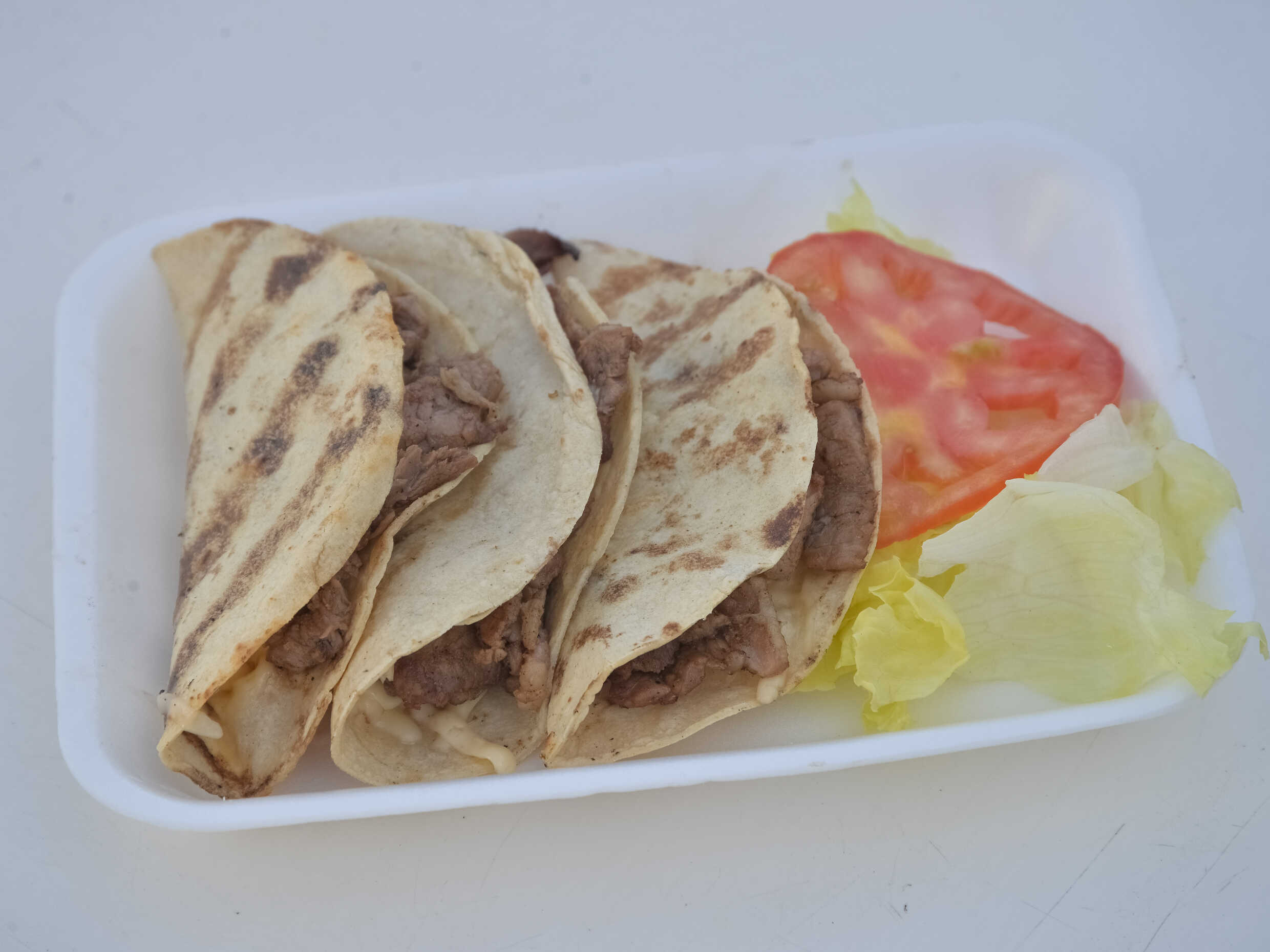 Orden con 3 quesadillas de maíz con carne picada, acompañada con ensalada.
