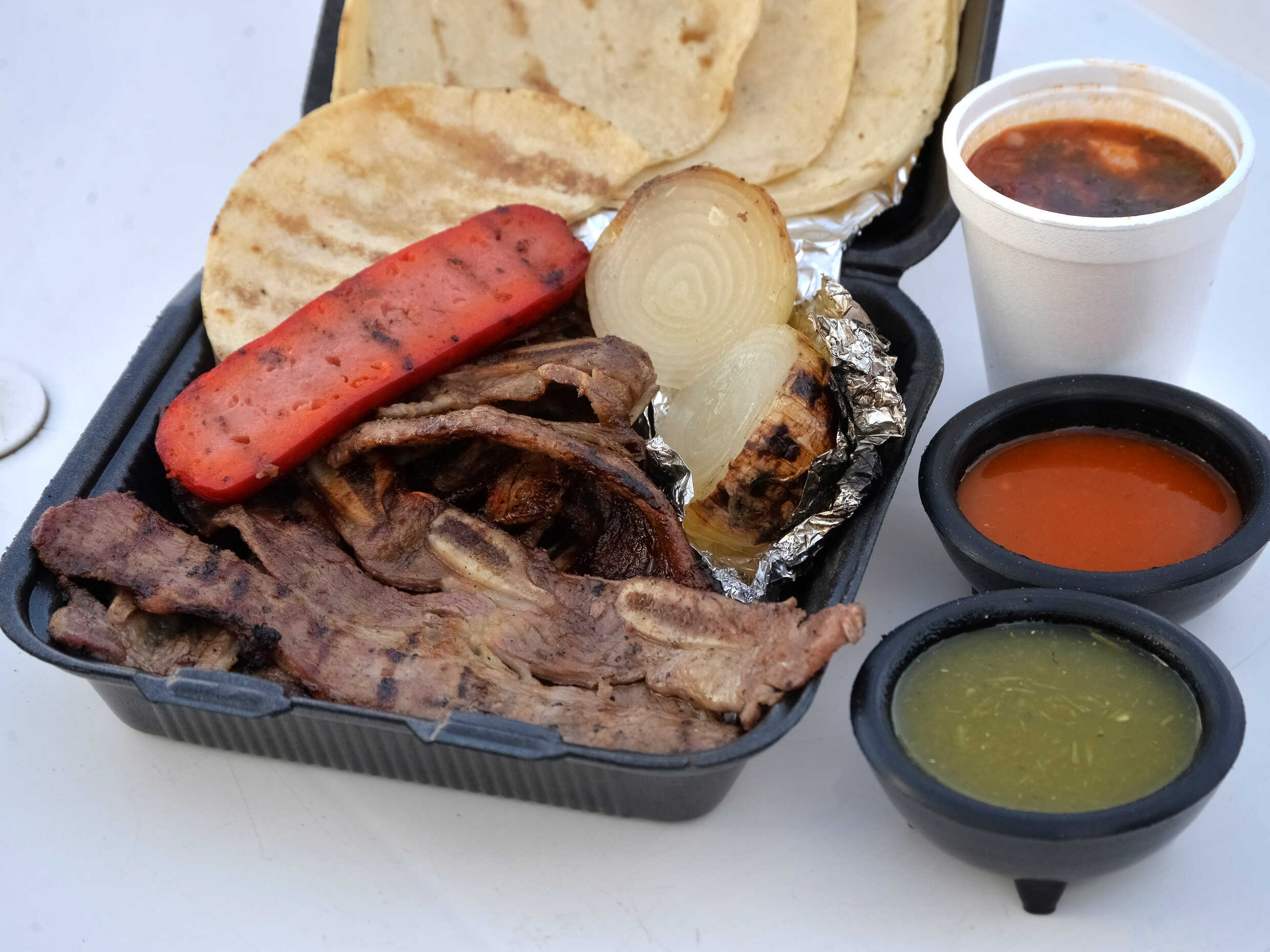 Incluye frijoles charros, cebollita asada, salchicha, quesadilla, tortillas y salsa.