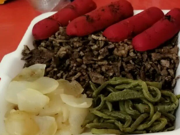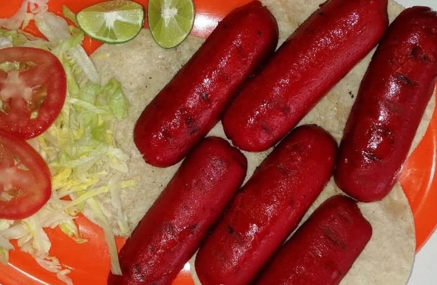 Salchicha asada individual acompañada de verdura.