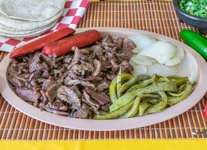Orden de carne asada (para 2 personas). Incluye complementos: salchicha, nopal o pico de gallo y cebolla asada, tortillas y salsas. (complementos sujetos a disponibilidad).