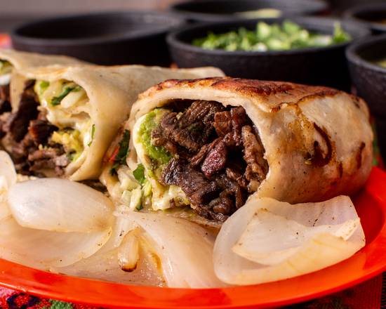 Deliciosa gringa acompañada de verdura, limón y salsas.