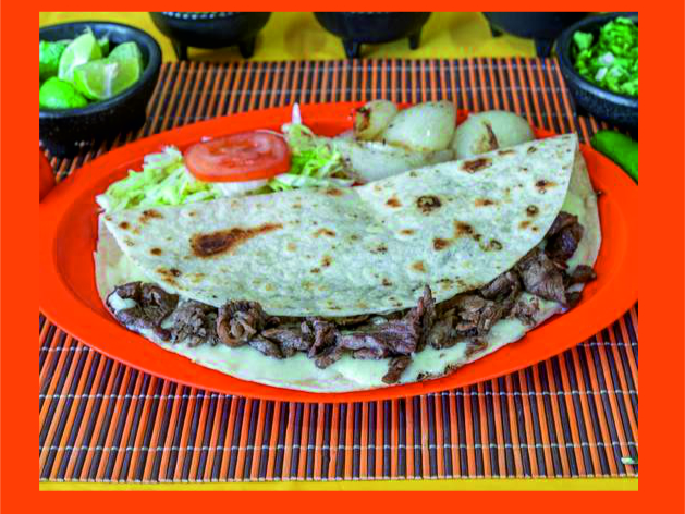 Quesadilla de harina, acompañada de verdura y salsas.