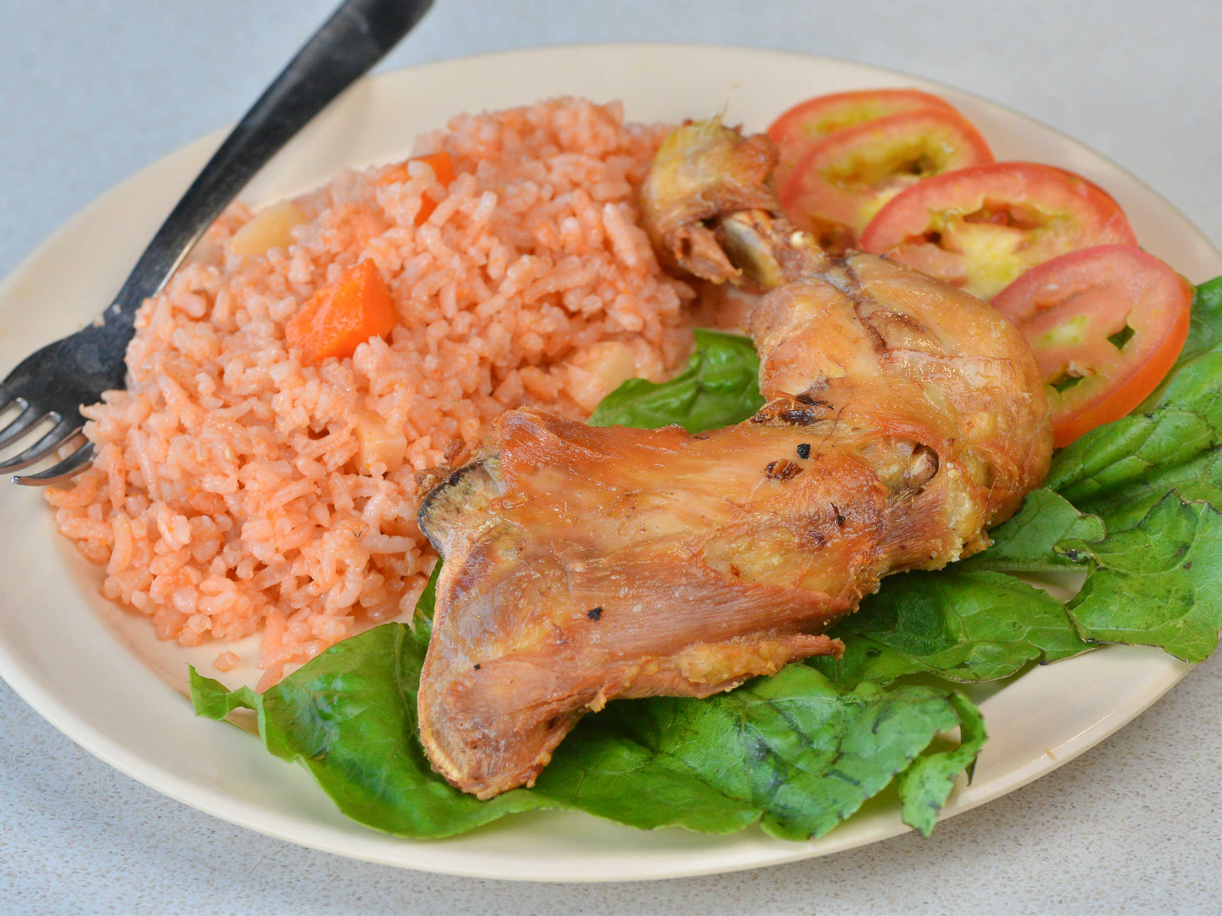 Riquísima pierna de pollo, frita en aceite, con guacamole, arroz y un consomé.