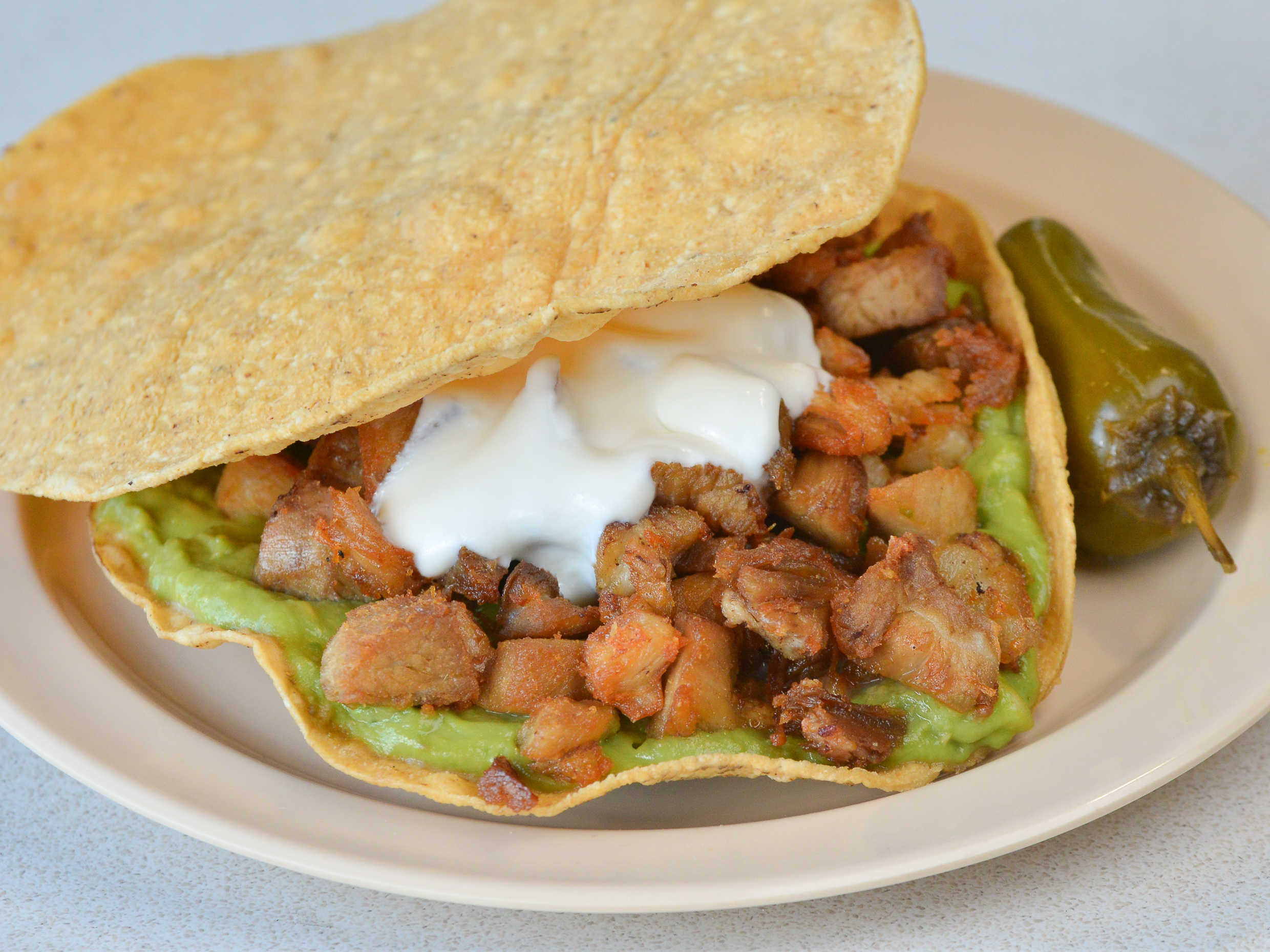 ¿Ya probaste esta delicia? Tostada gigante con ricas carnitas desmenuzadas con guacamole y crema.
