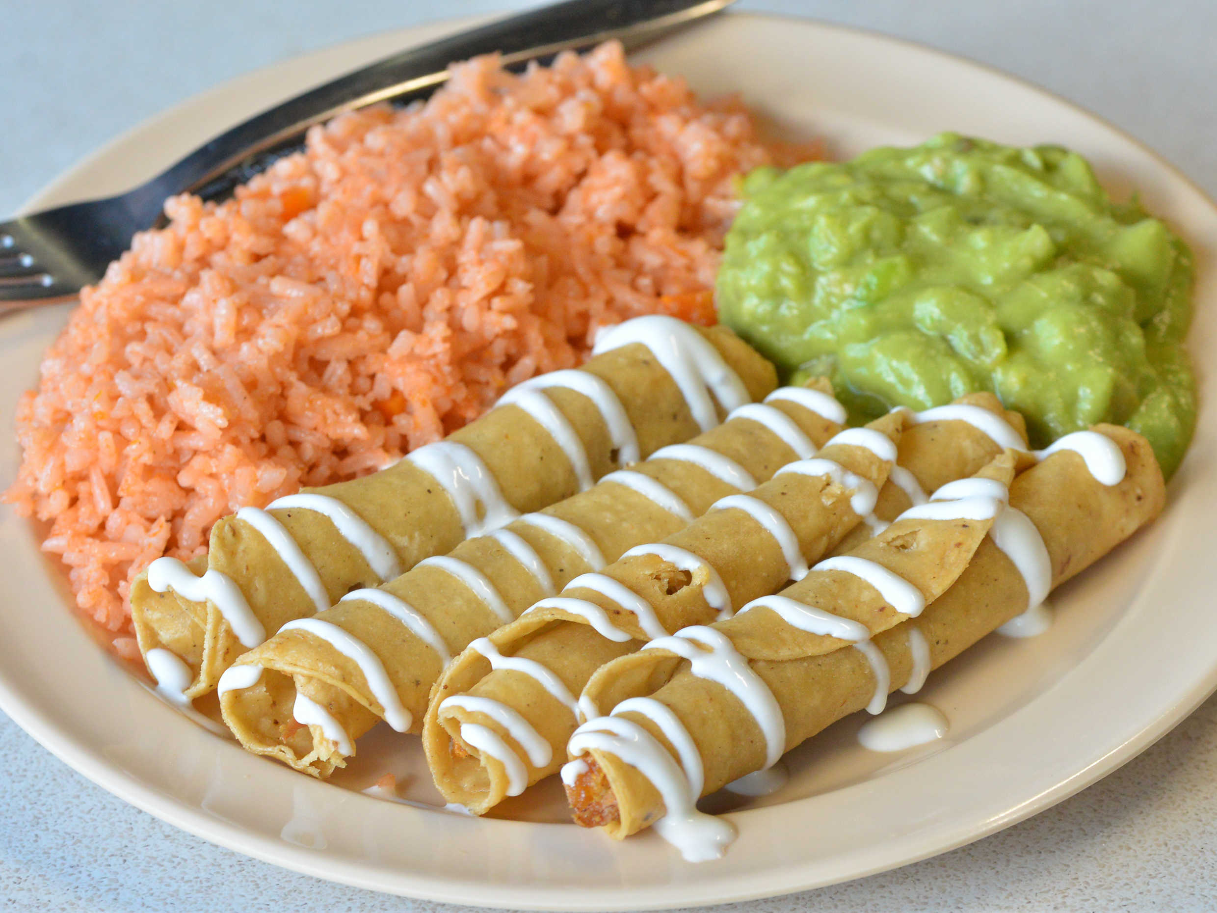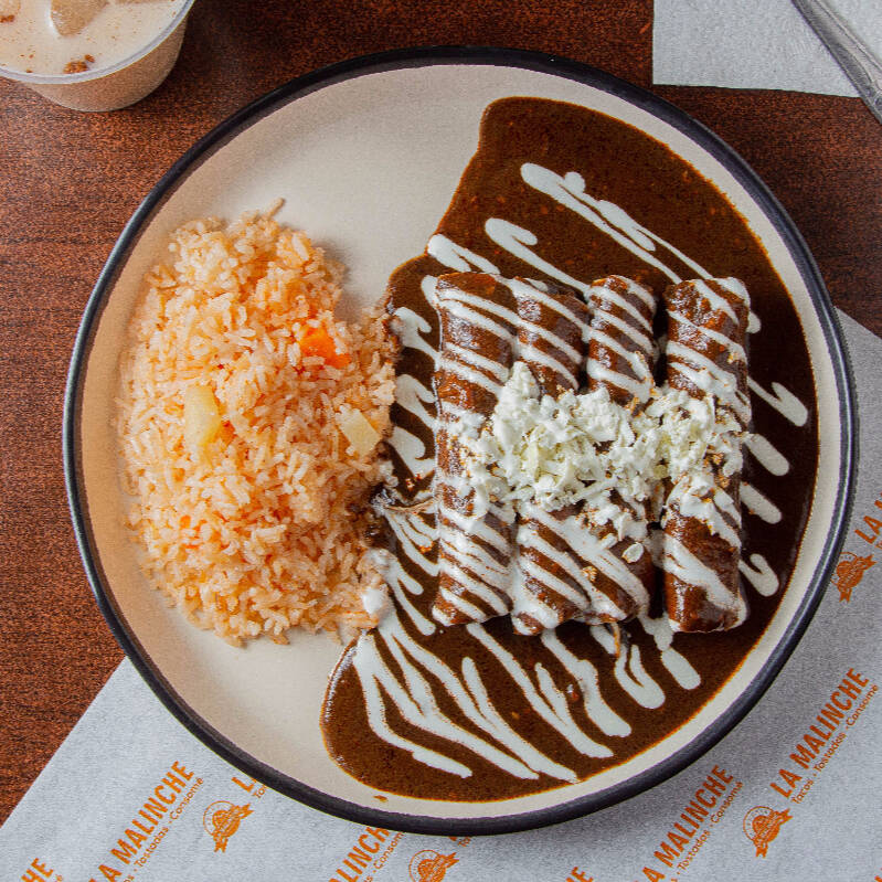 Riquísima tortillas enchiladas con nuestro tradicional mole rojo, rellenas de pollo, y acompañadas con arroz.