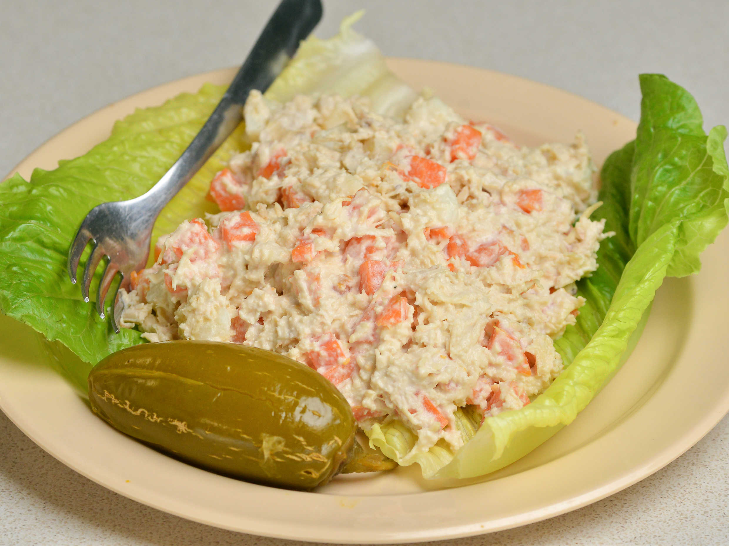 Pechuga desmenuzada, mezclada con rica zanahoria, papa y crema, sobre una cama de lechuga.