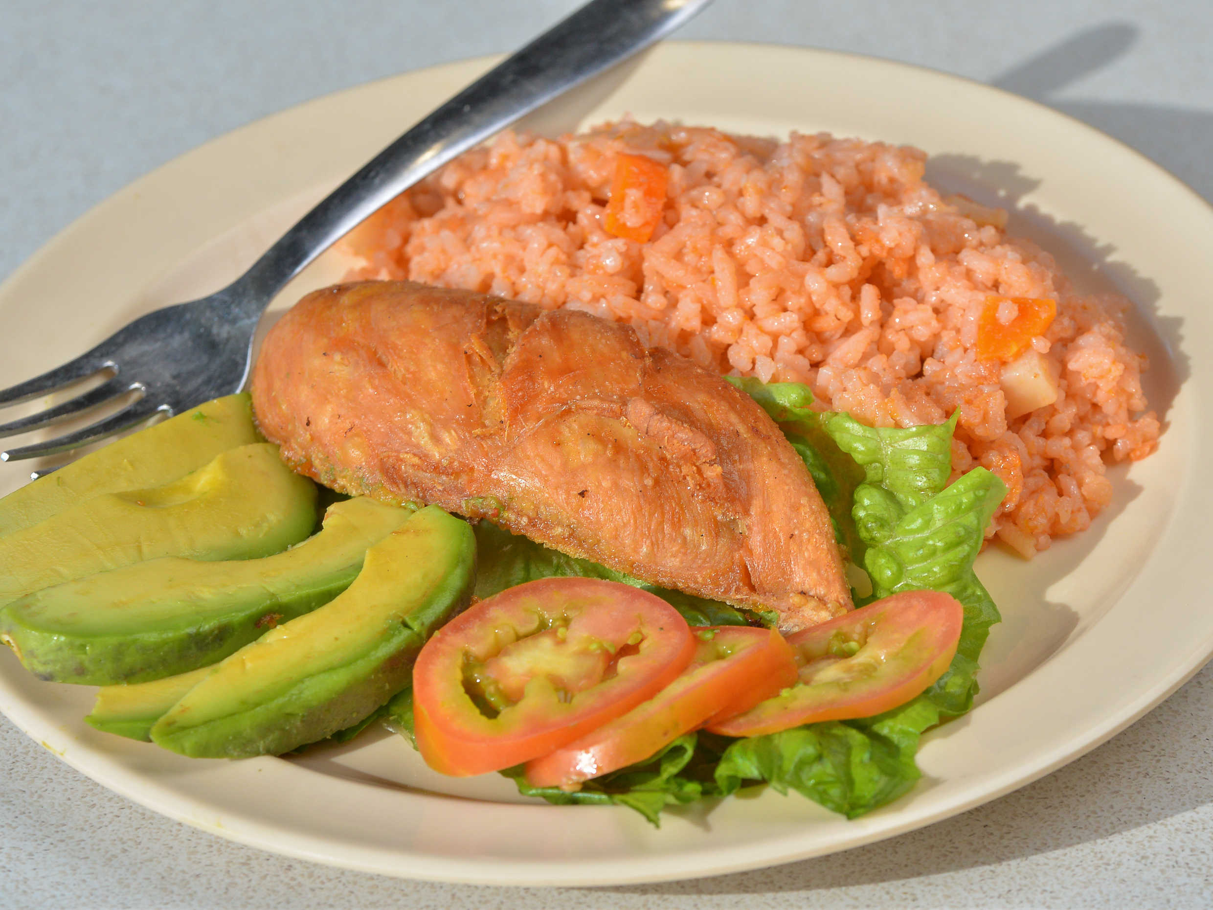 Riquísima pechuga de pollo frita en aceite, con guacamole, arroz y un consomé.