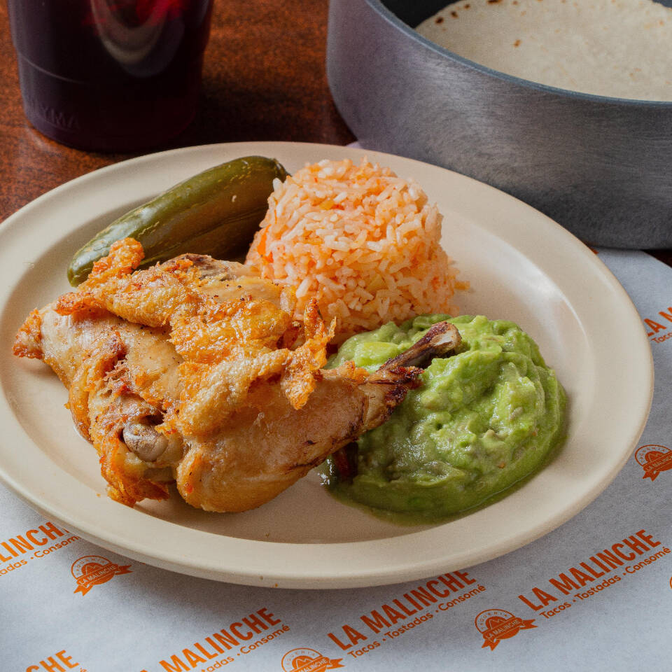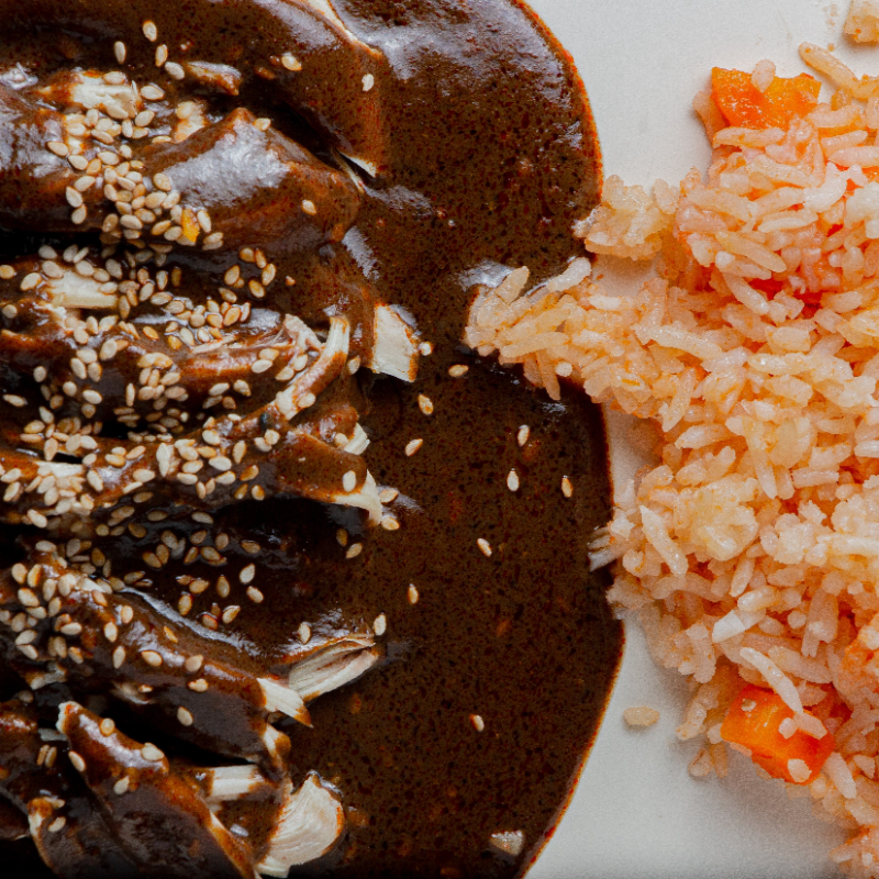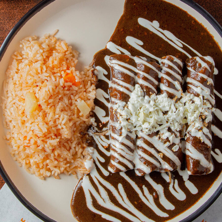 Tortillas enchiladas con nuestro tradicional mole rojo rellenas de pollo, acompañadas de arroz.