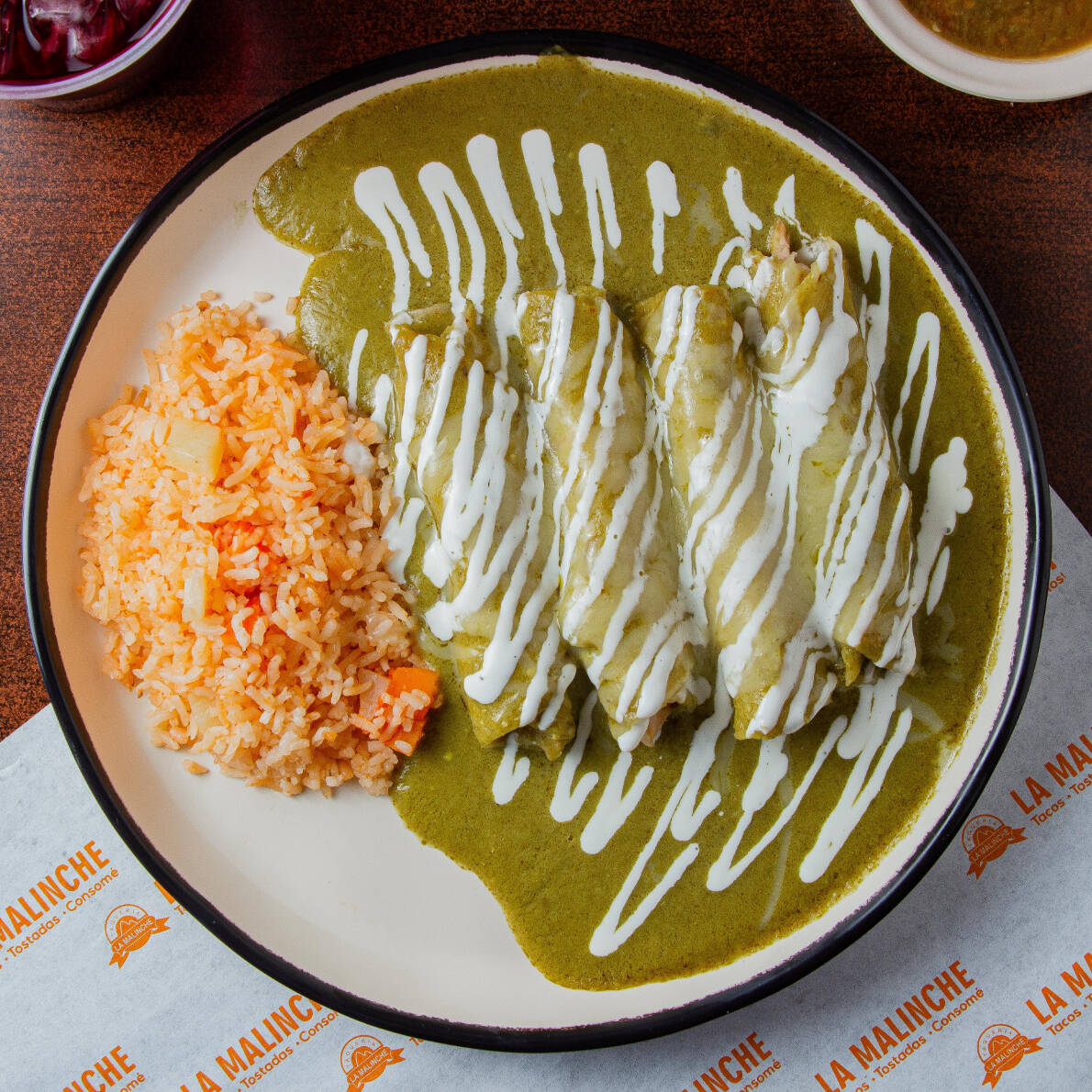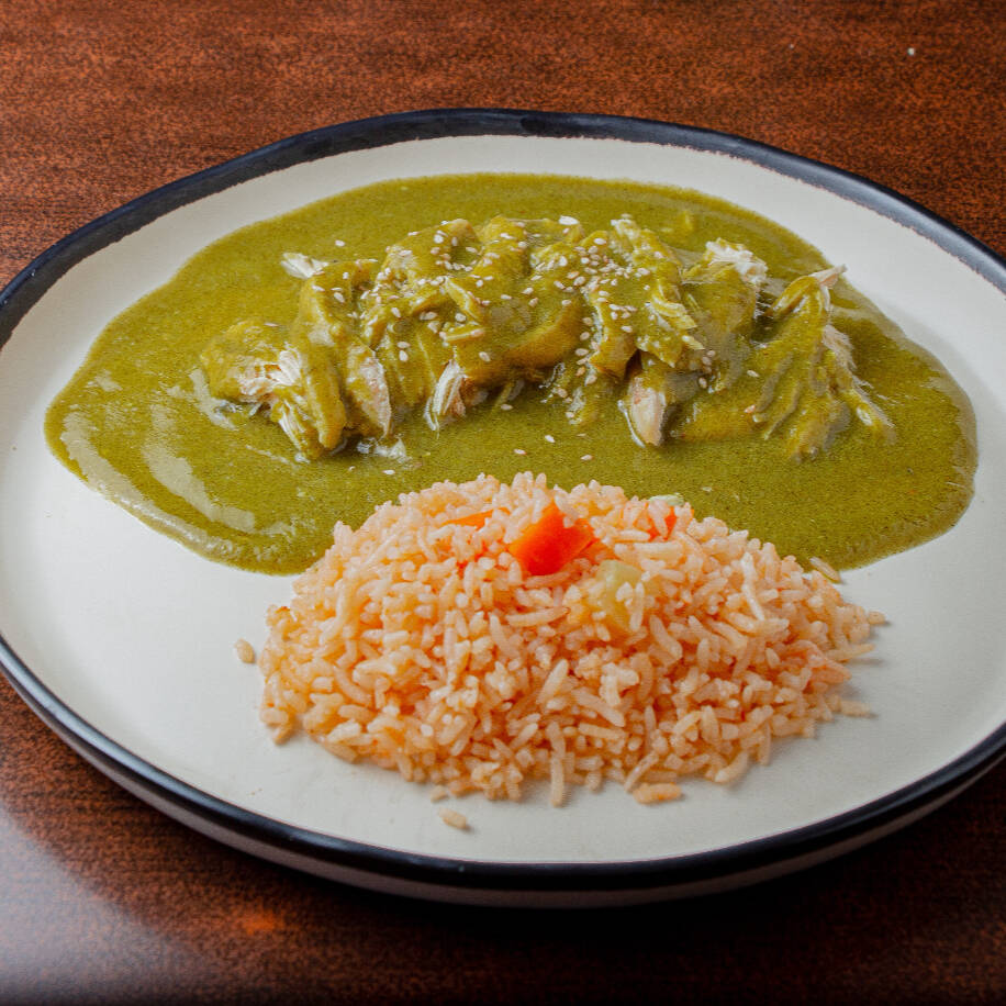 Tortillas enchiladas con nuestra salsa verde,, rellenas de pollo, acompañadas con arroz.