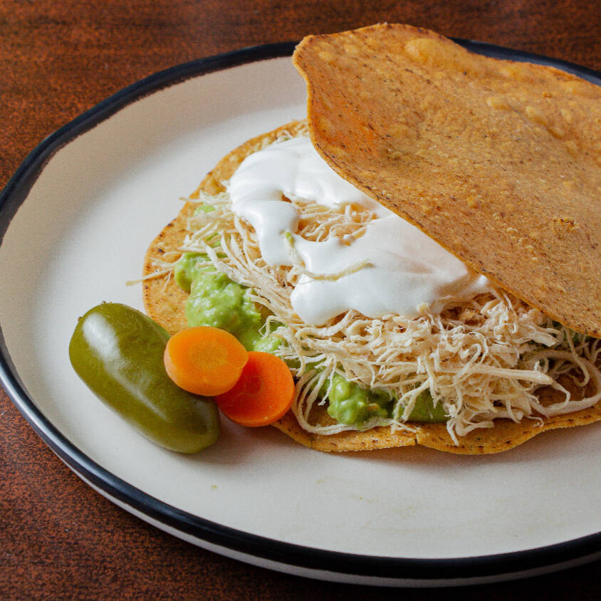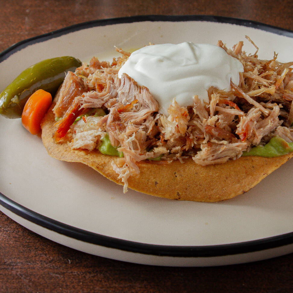 Tostada gigante con ricas carnitas desmenuzadas con guacamole y crema.