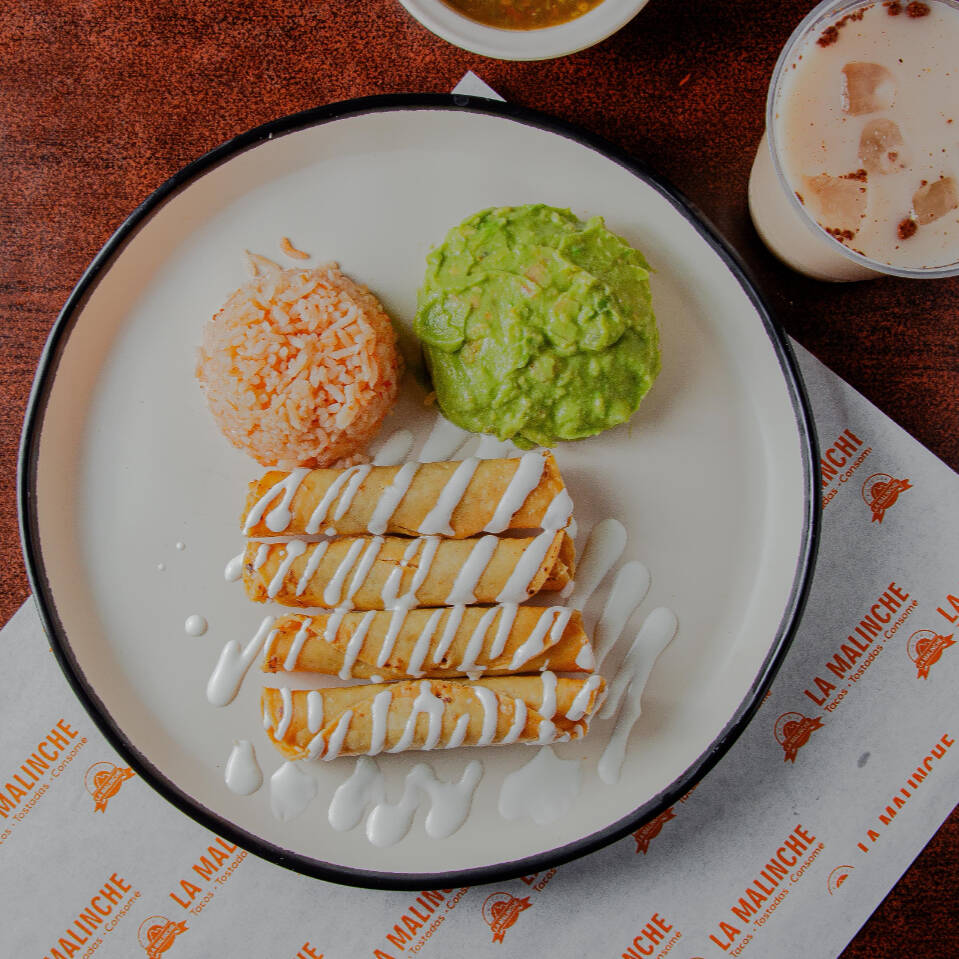 Tacos dorados, acompañados de guacamole, crema y arroz.