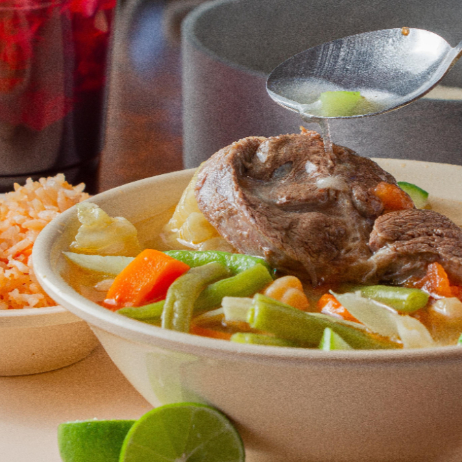 Caldo con verduras, arroz, aguacate, queso, y carne de res.