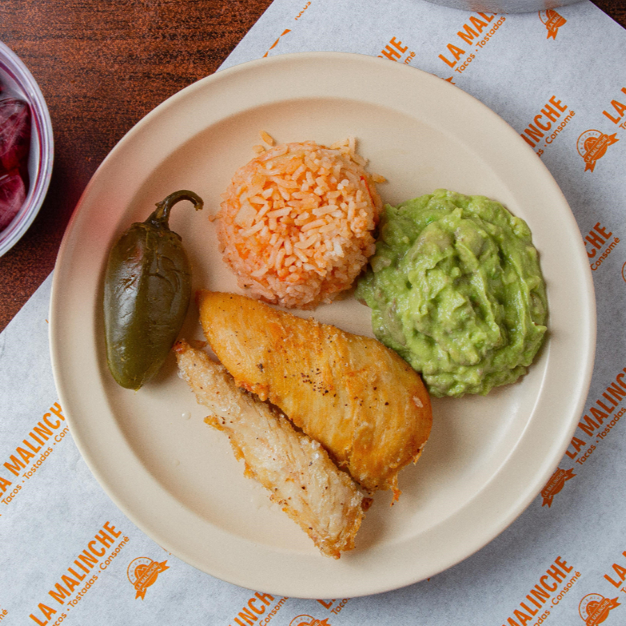 Jugosa pechuga de pollo, acompañada de lechuga, tomate, aguacate, queso y zanahoria rayada.