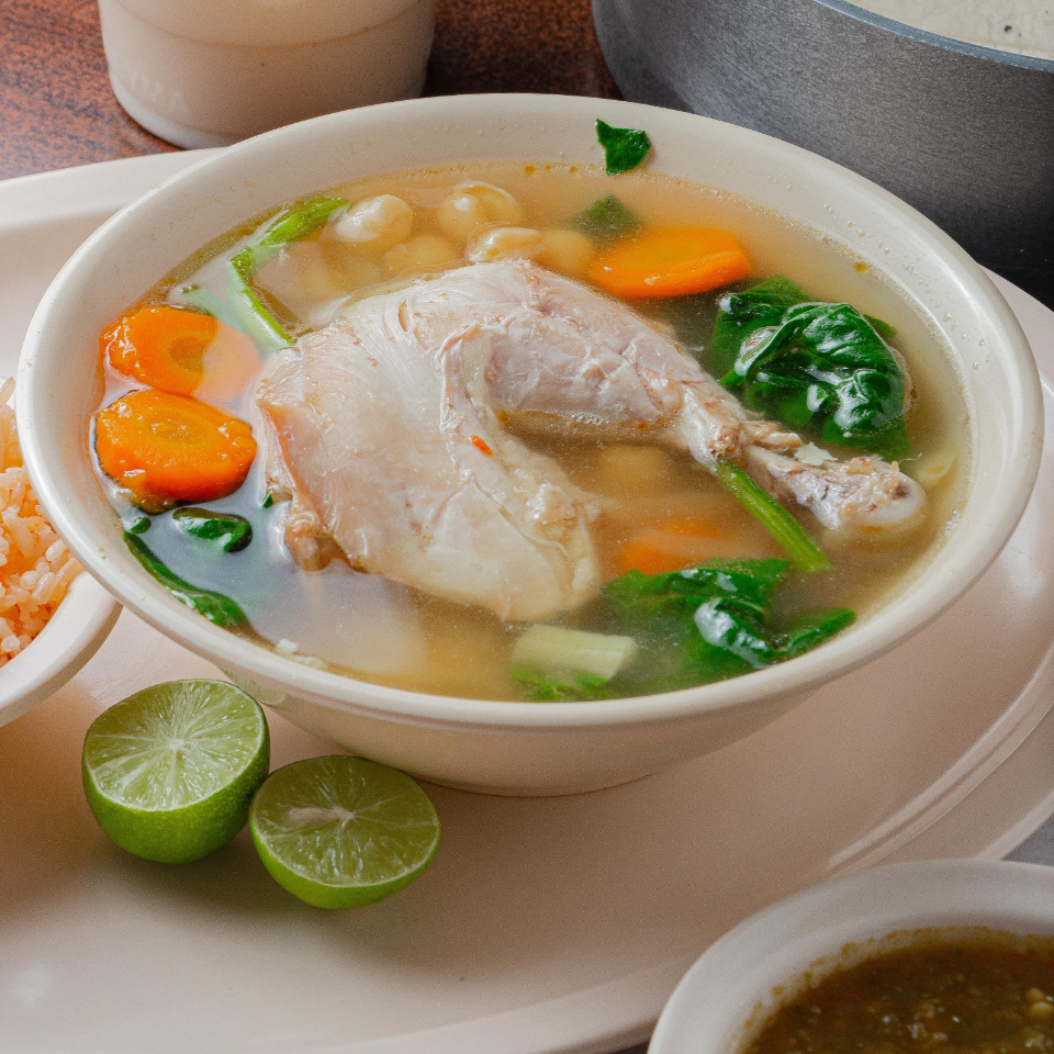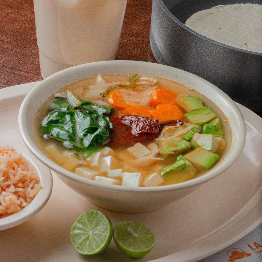 Caldo con verduras, arroz, aguacate, queso, chipotle y pechuga de pollo.
