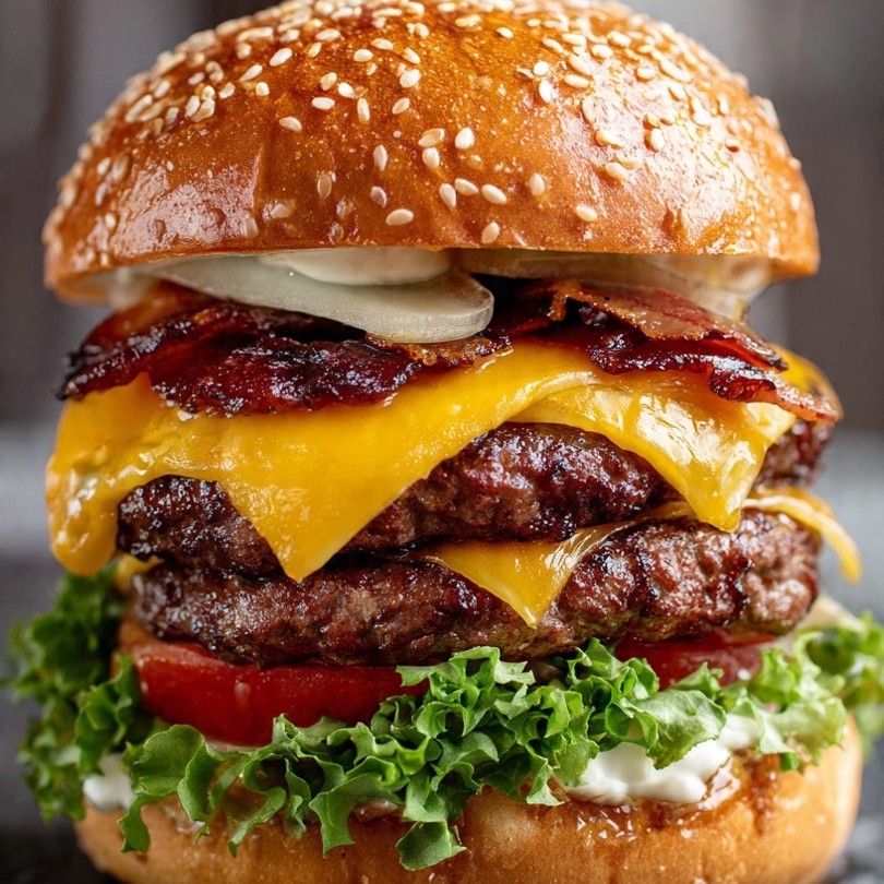 Doble carne de res, queso americano, jamón, tocino, aguacate, verduras y aderezos.