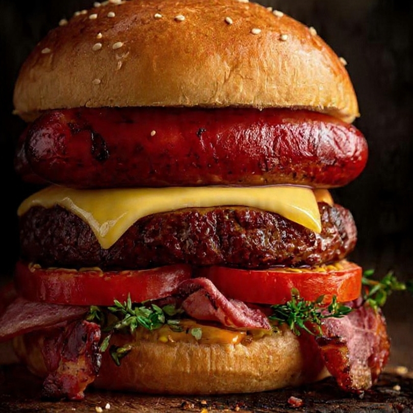 Doble carne de hamburguesa, salchicha asada, queso, jamon, tocino, aguacate, verduras y aderezos