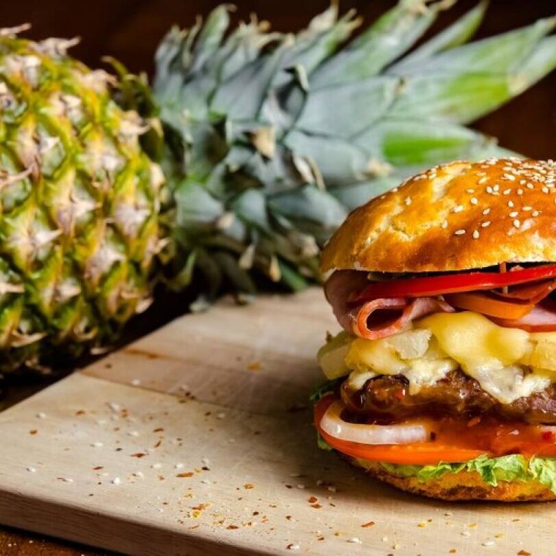 130g carne molida, Queso, Jamon, Tocino, Piña, Lechuga, Cebolla, Tomate, Jalapeños, Mayonesa, Mostaza, Catsup