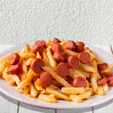 papas a la francesa con salchica frita, Cátsup, Mayonesa, Queso amarillo, BBQ, Ranch, bufalo.