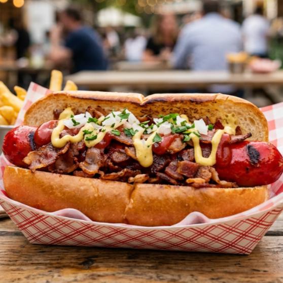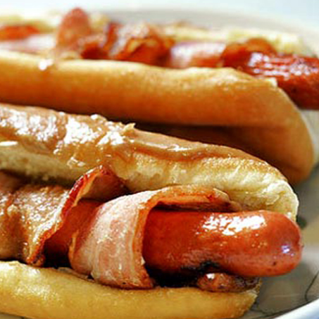 Pan, Salchicha para Asar, Tocino, Lechuga, Cebolla, Tomate,jalapeños, Mostaza, Mayonesa, Cátsup.