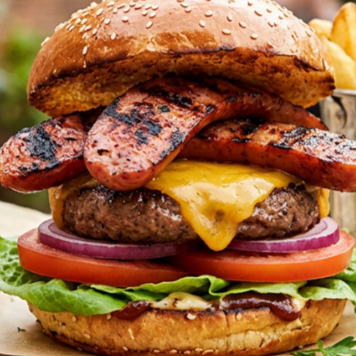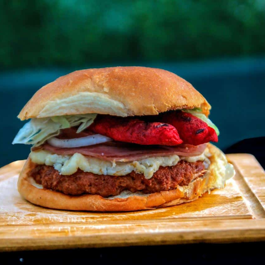 130g carne molida, Queso, Jamon, Tocino, Lechuga, Cebolla, Tomate, Jalapeños, Mayonesa, Mostaza, Catsup