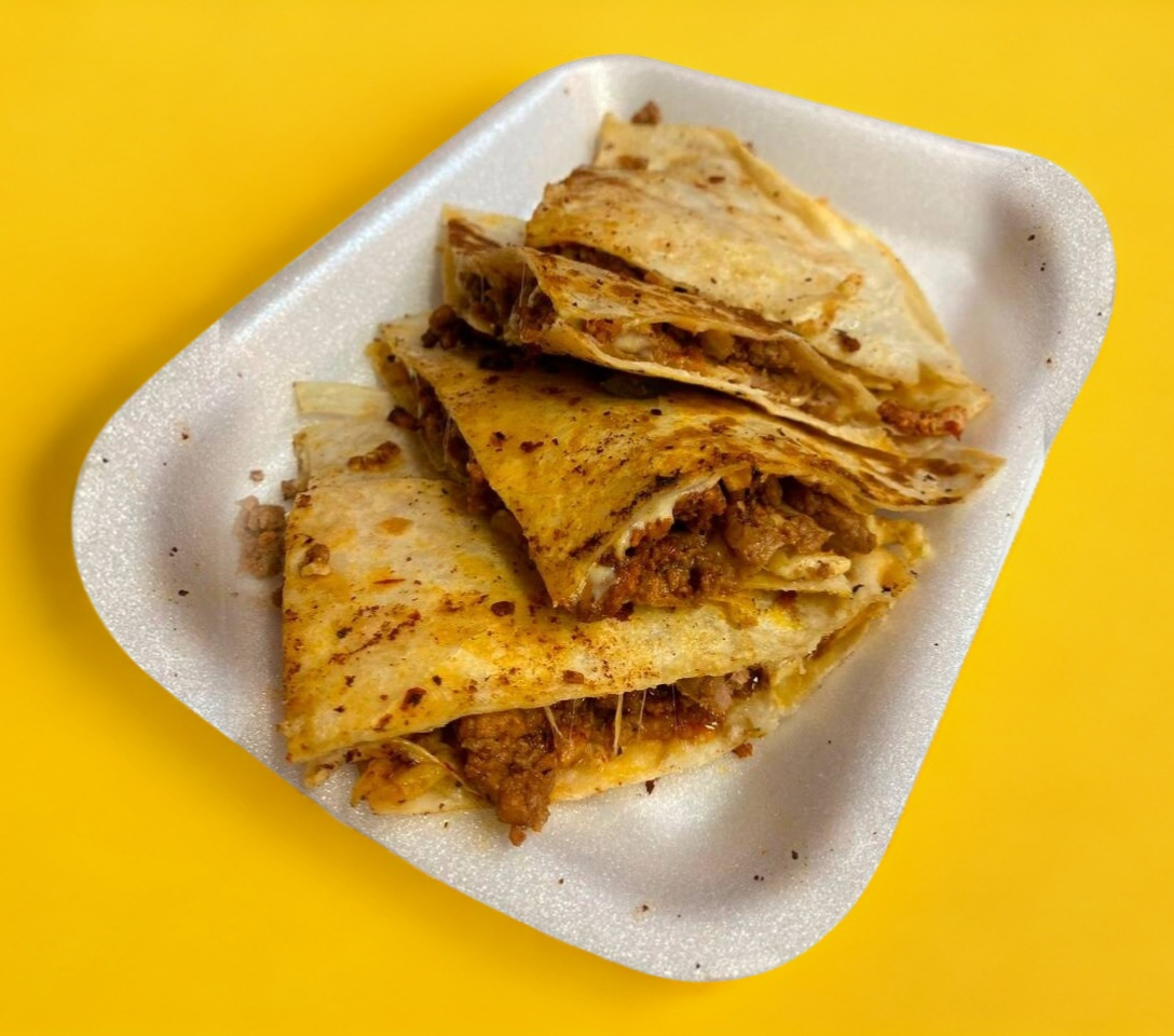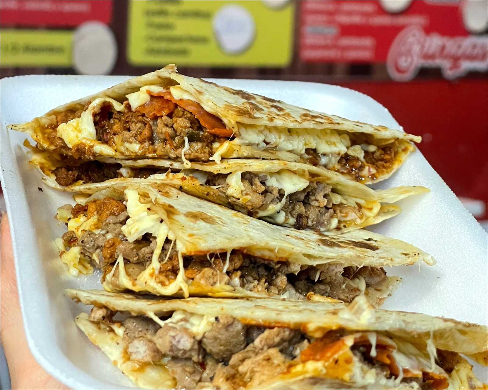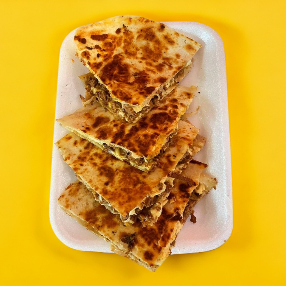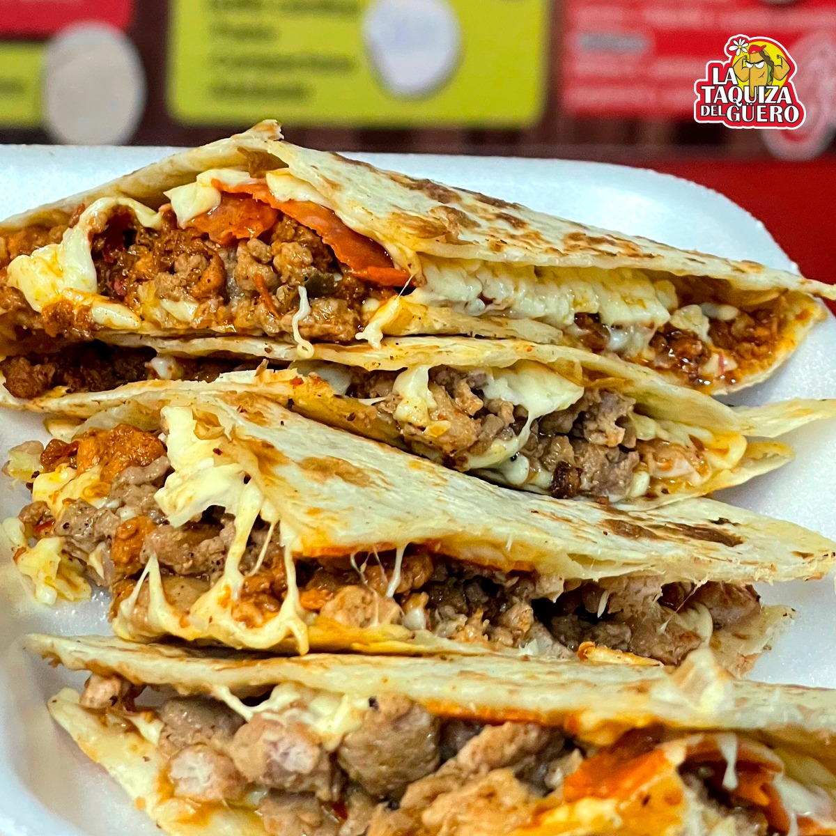 Tortilla de harina con relleno bistec de res, carne adobada de cerdo, chipotle, queso amarillo y chihuahua. salsas verde, roja, morita y verduras.