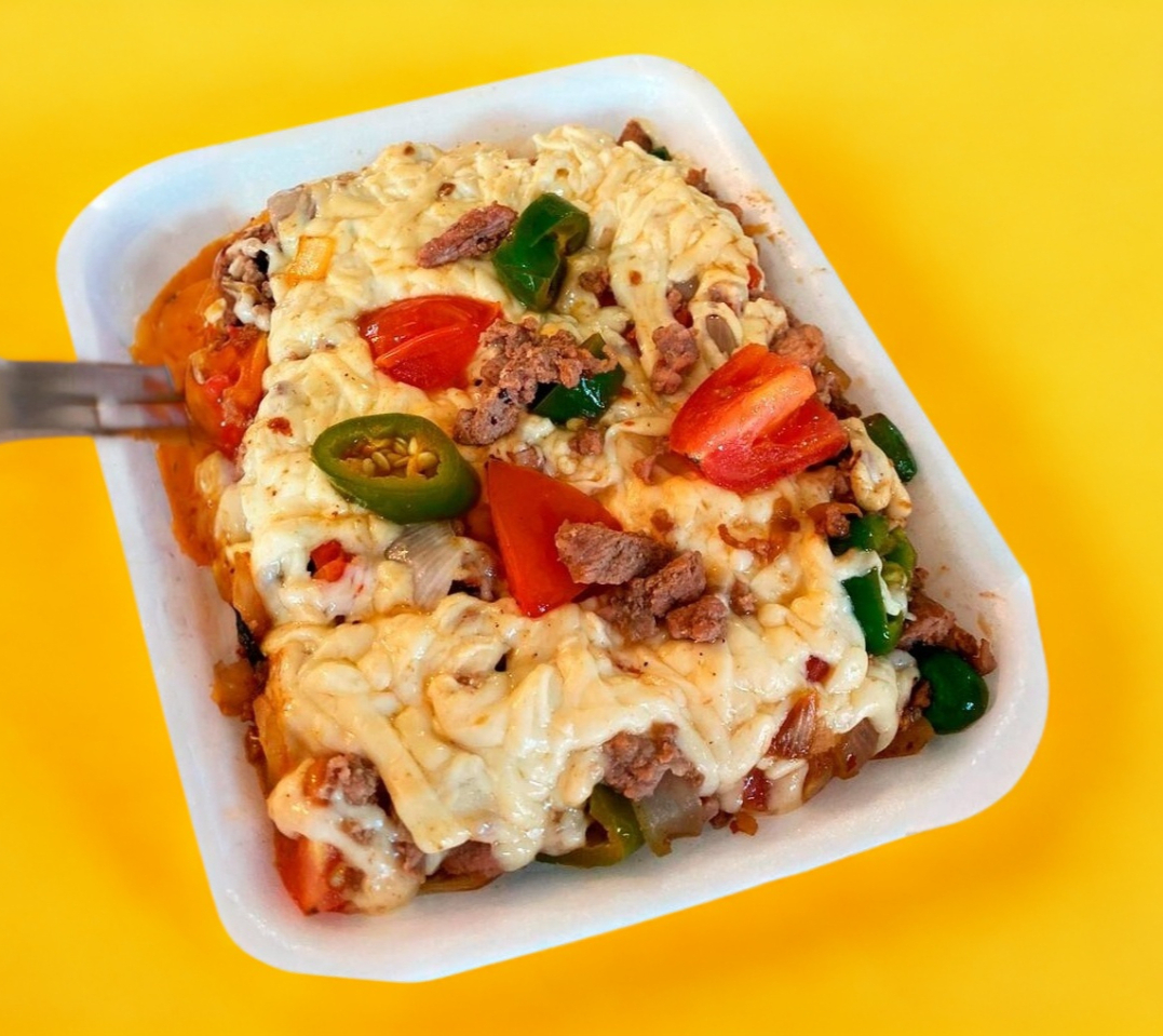 Alambre mexicano con bistec de res, queso, tocino de puerco, tomate, jalapeño y cebolla, 500 gr. con porción de tortillas.