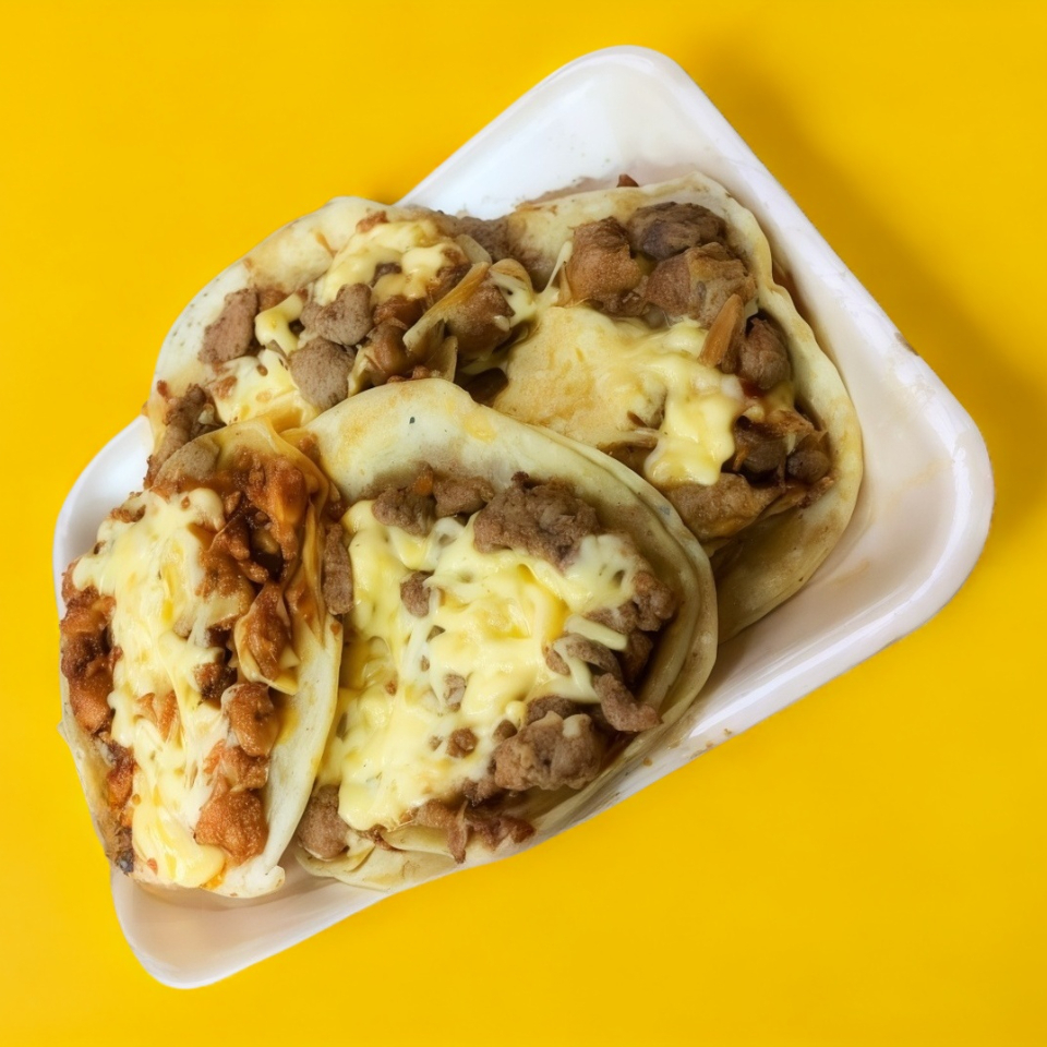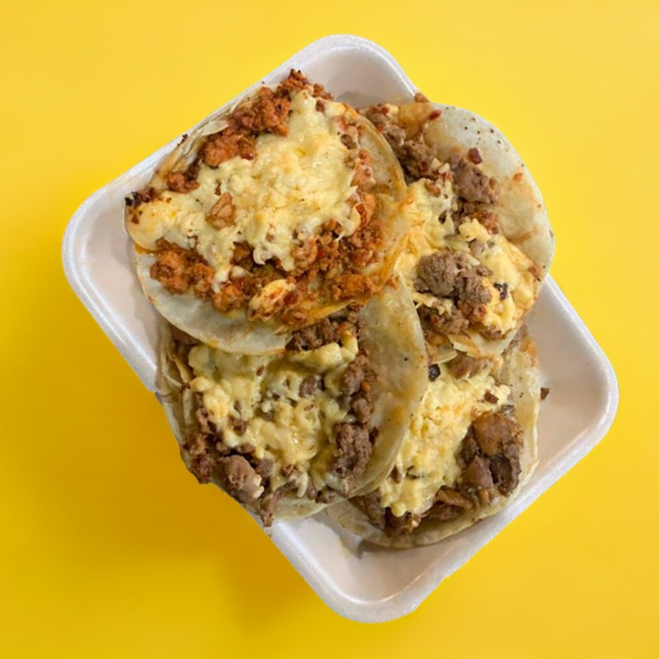 4 Tacos en tortilla de maíz con bistec de res, carne adobada de puerco, cebolla asada. aparte, verduras, salsa roja, verde y morita.