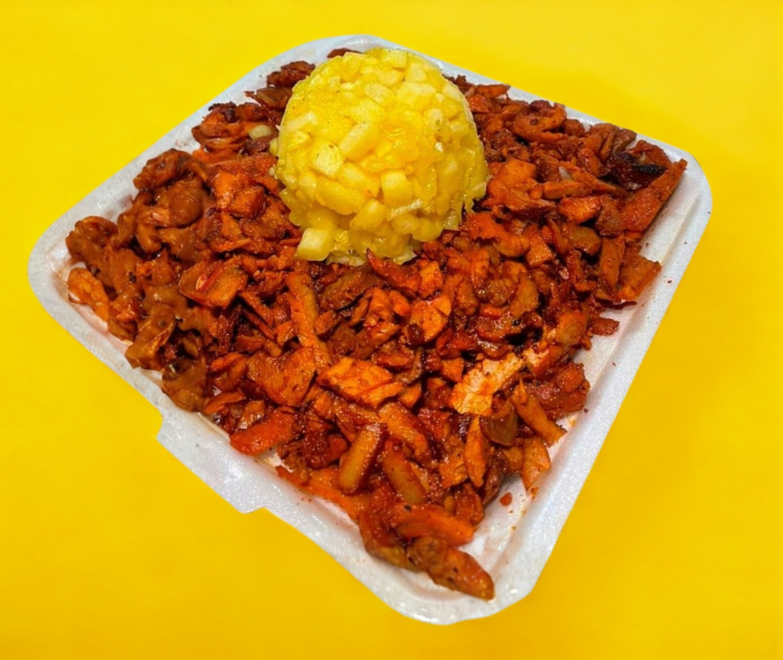 Tortilla de harina con relleno carne adoba de cerdo, piña, chipotle, queso fundido. aparte salsas verde, roja, morita y verdura.