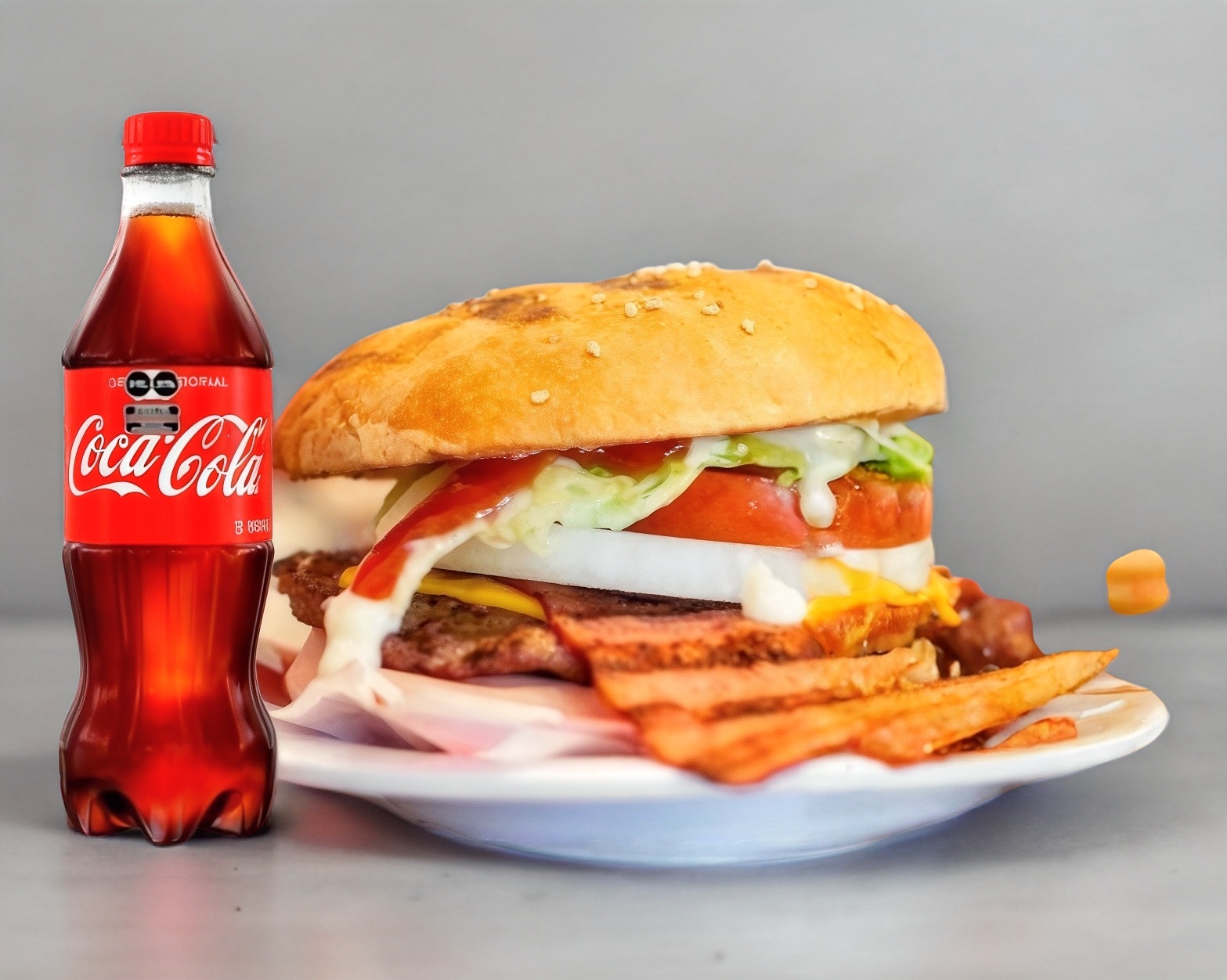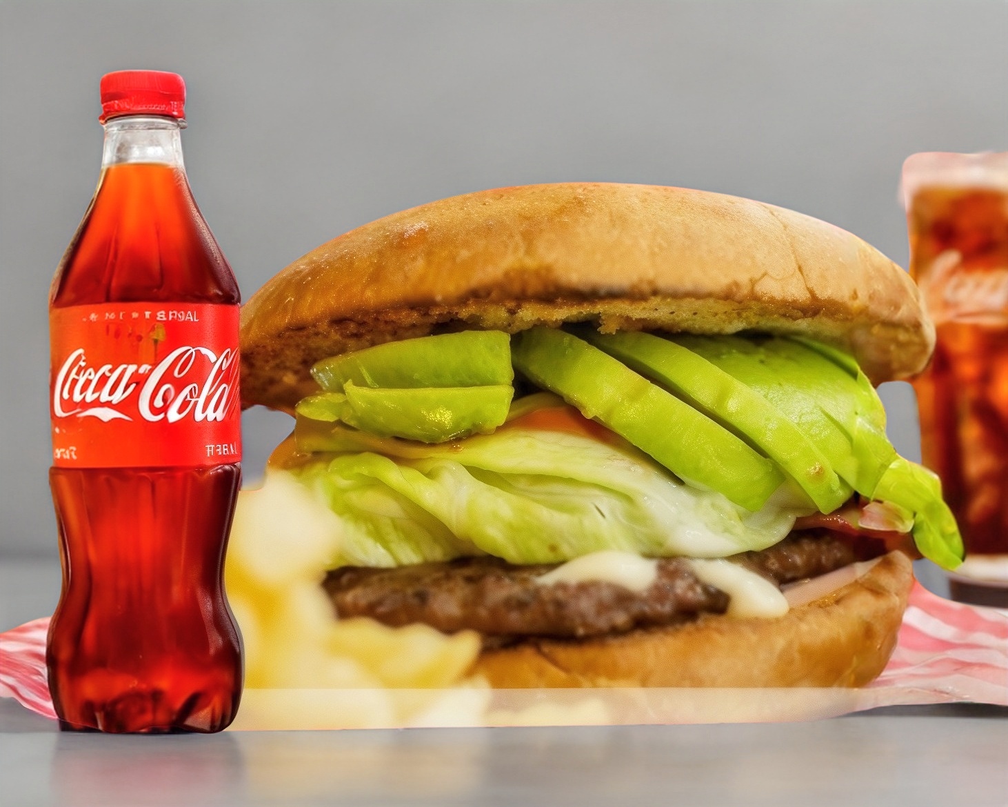 hamburguesa con queso, tocino, jamon y salcicha para asar papas y refresco de 400 ml