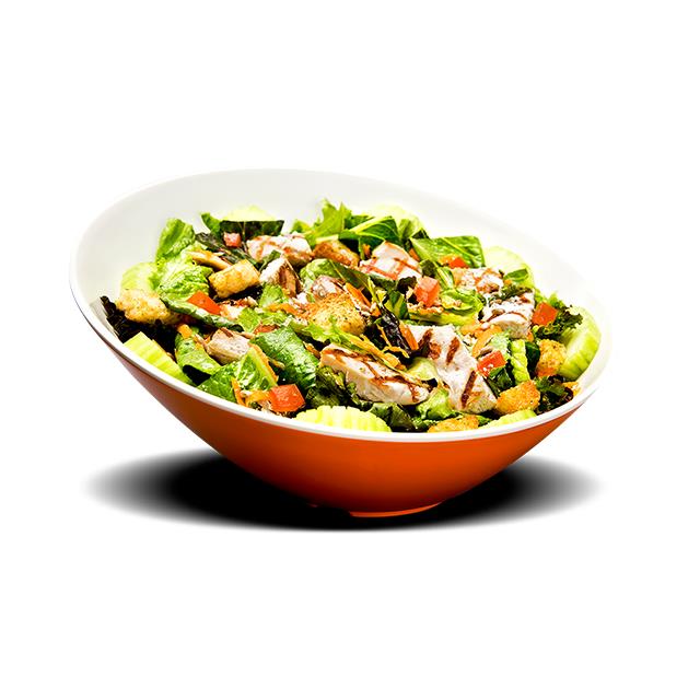 1/" Ensalada con pechuga de pollo empanizada (115 g) en tu salsa favorita y con lechugas, queso MTY Jack, pico de gallo, tiras de tortilla y aderezo.