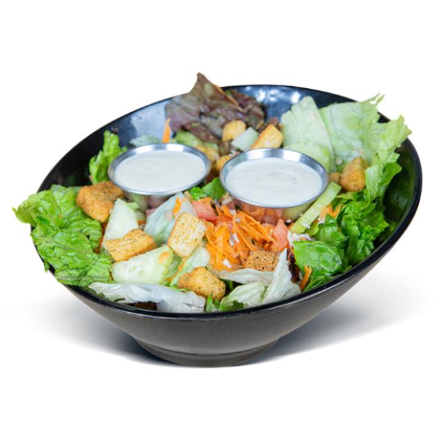 Ensalada mediana con mezcla de lechugas, zanahoria, pepino, tomate, queso parmesano, semillas de girasol, crutones y aderezo.