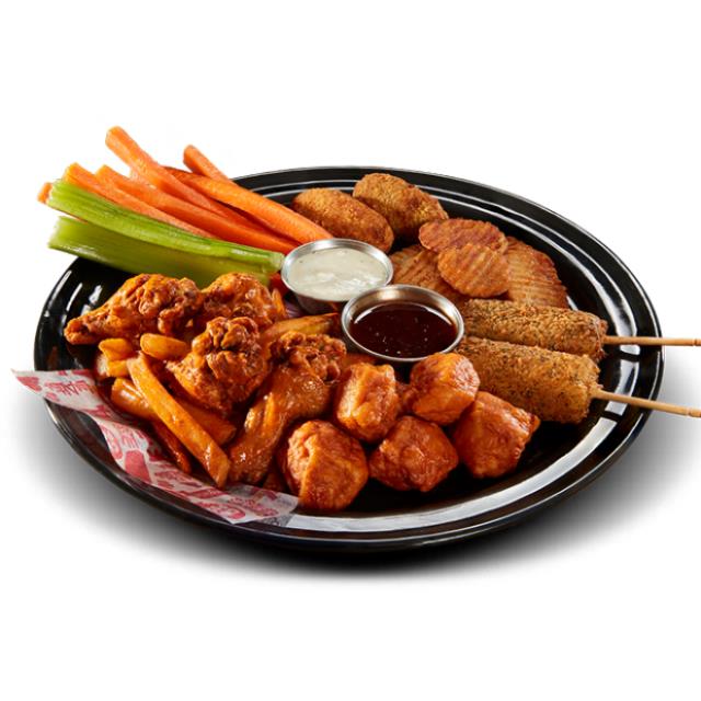 4 alitas (280 g), 5 Boneless (100 g), Chepos (90 g), Robbys (2 pzs), Cheese Pops (2 pzs), Búfalo Rúffles (100 g). Con Berry Chipotle y Blue Cheese.