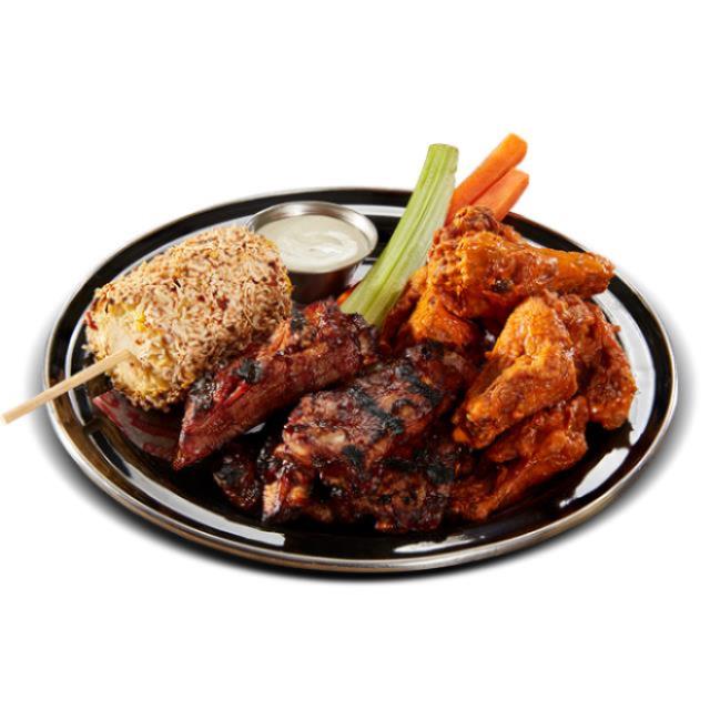 Suaves y jugosas costillitas (210 g) + alitas (420g) con salsa a elegir, aderezo blue cheese y vegetales frescos + 1/2 elotito