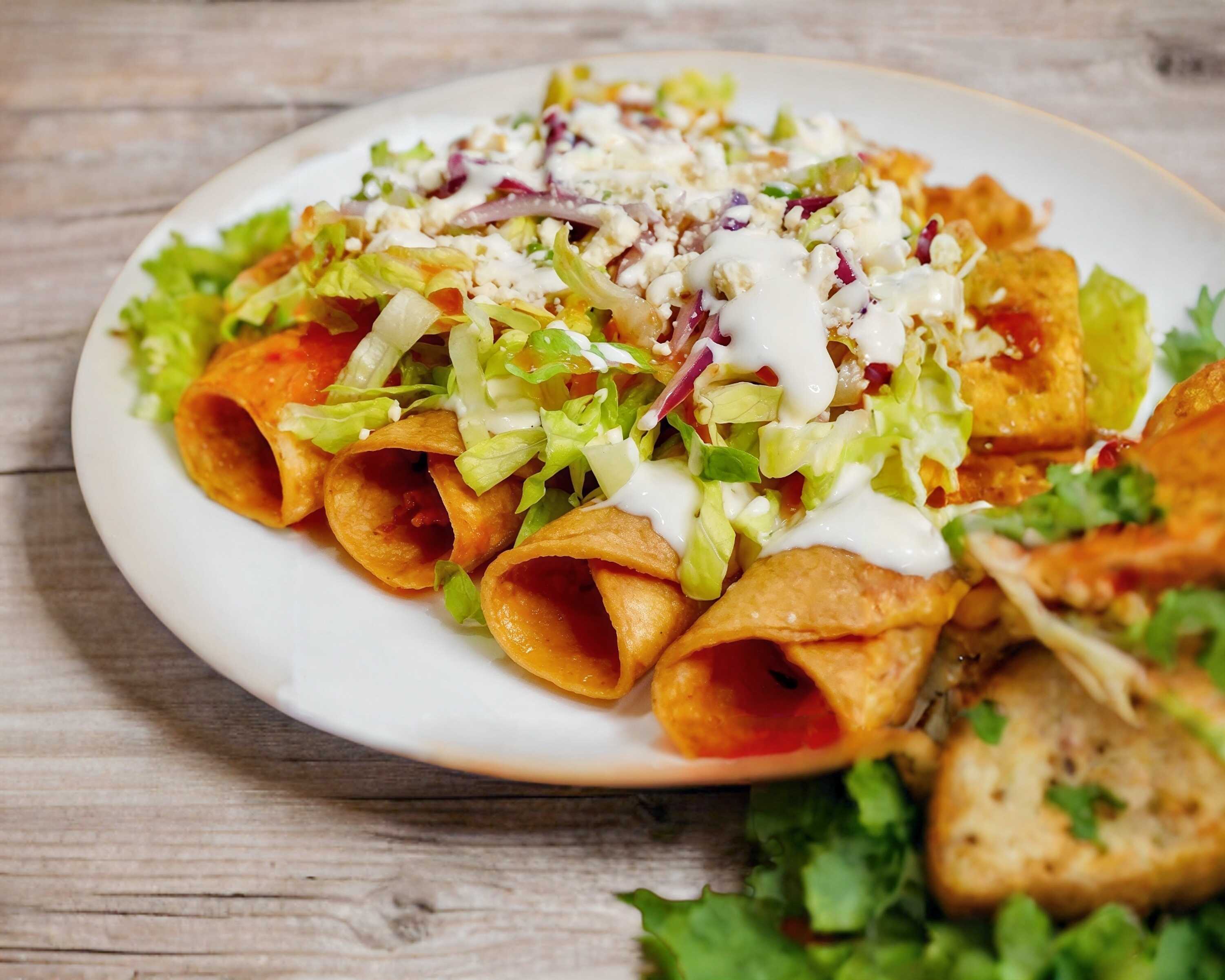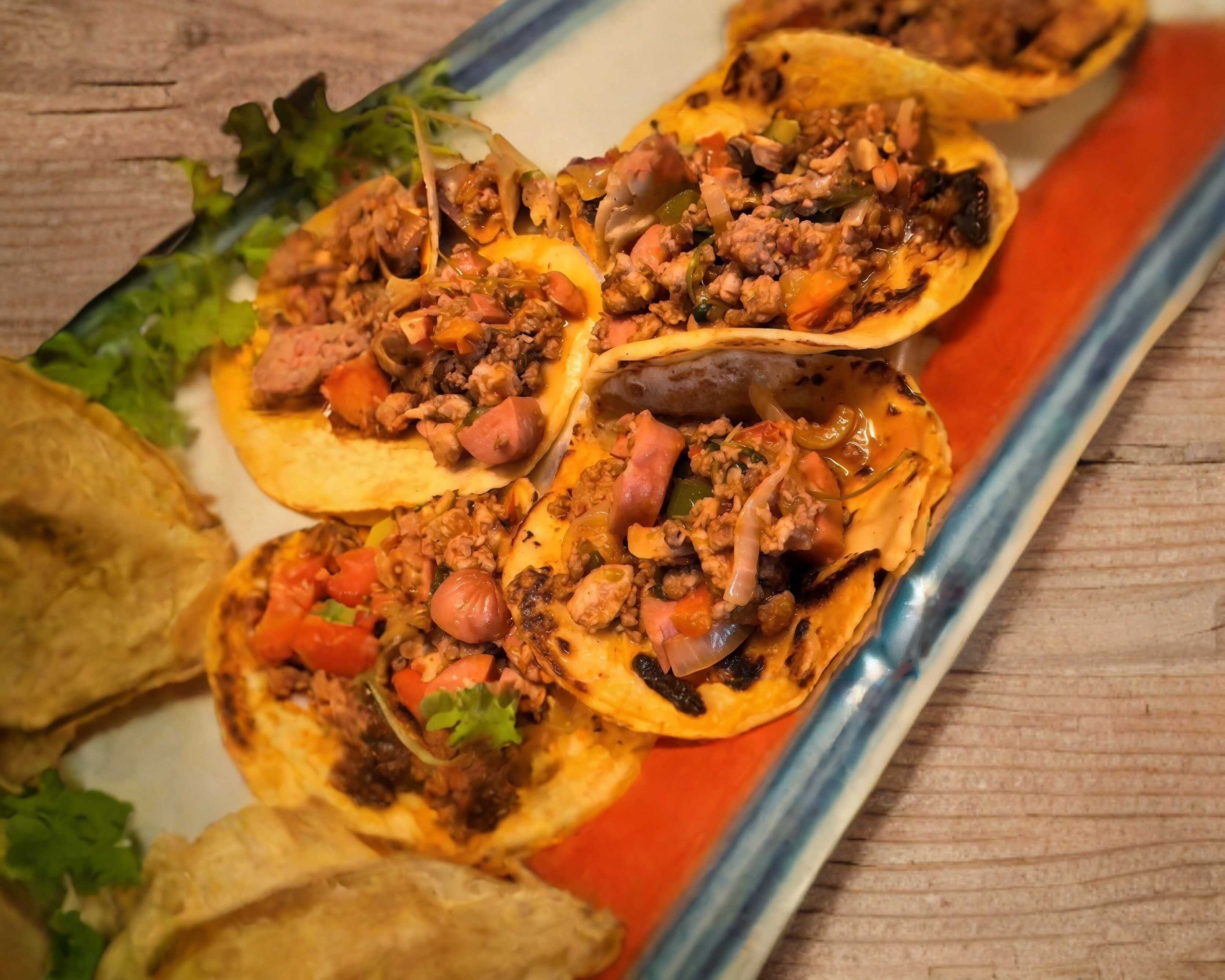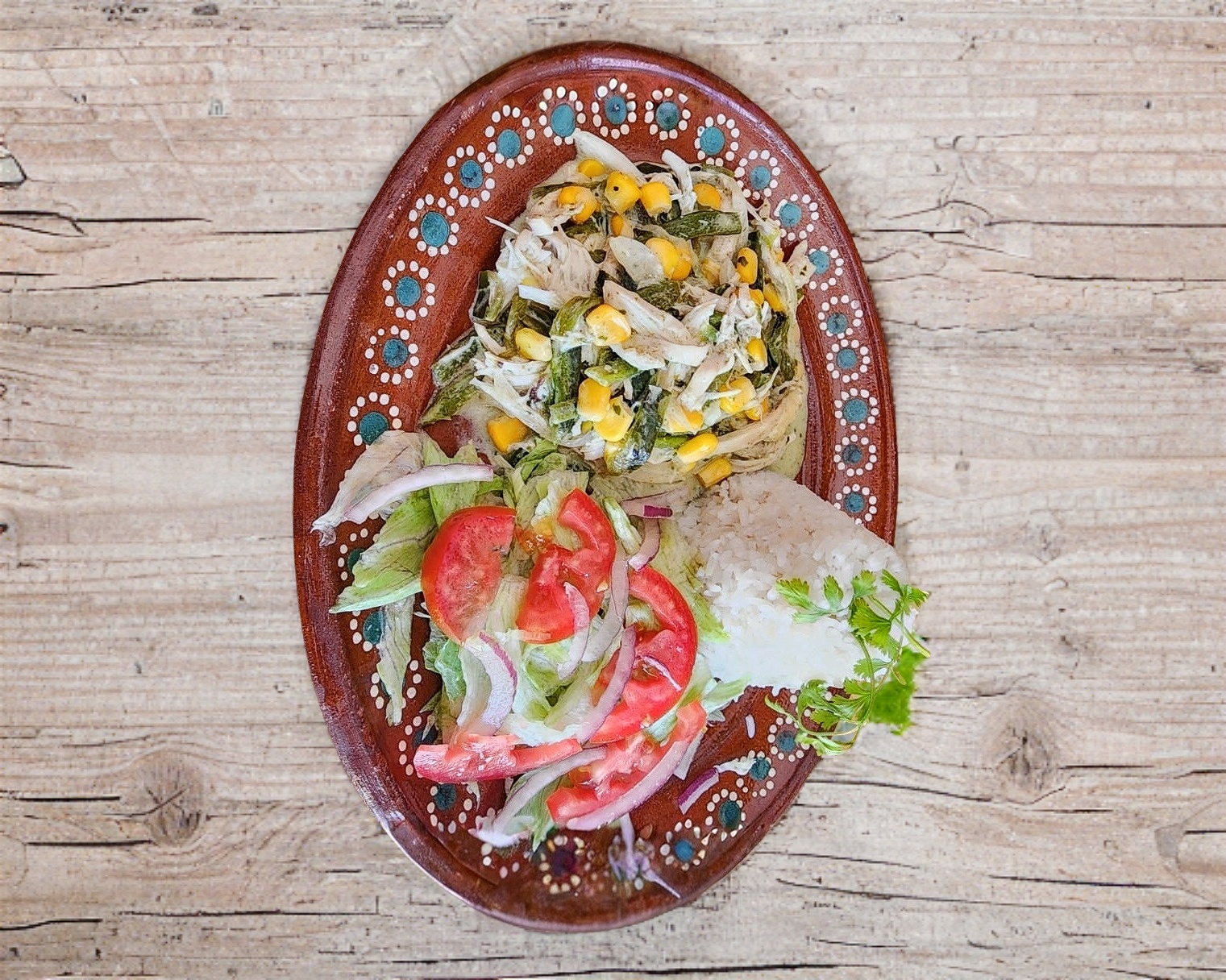 2 tacos de rajas con queso, 2 pollo, y 2 desebrada arroz o spaguetti (especificar), ensalada de lechuga y tomate.
