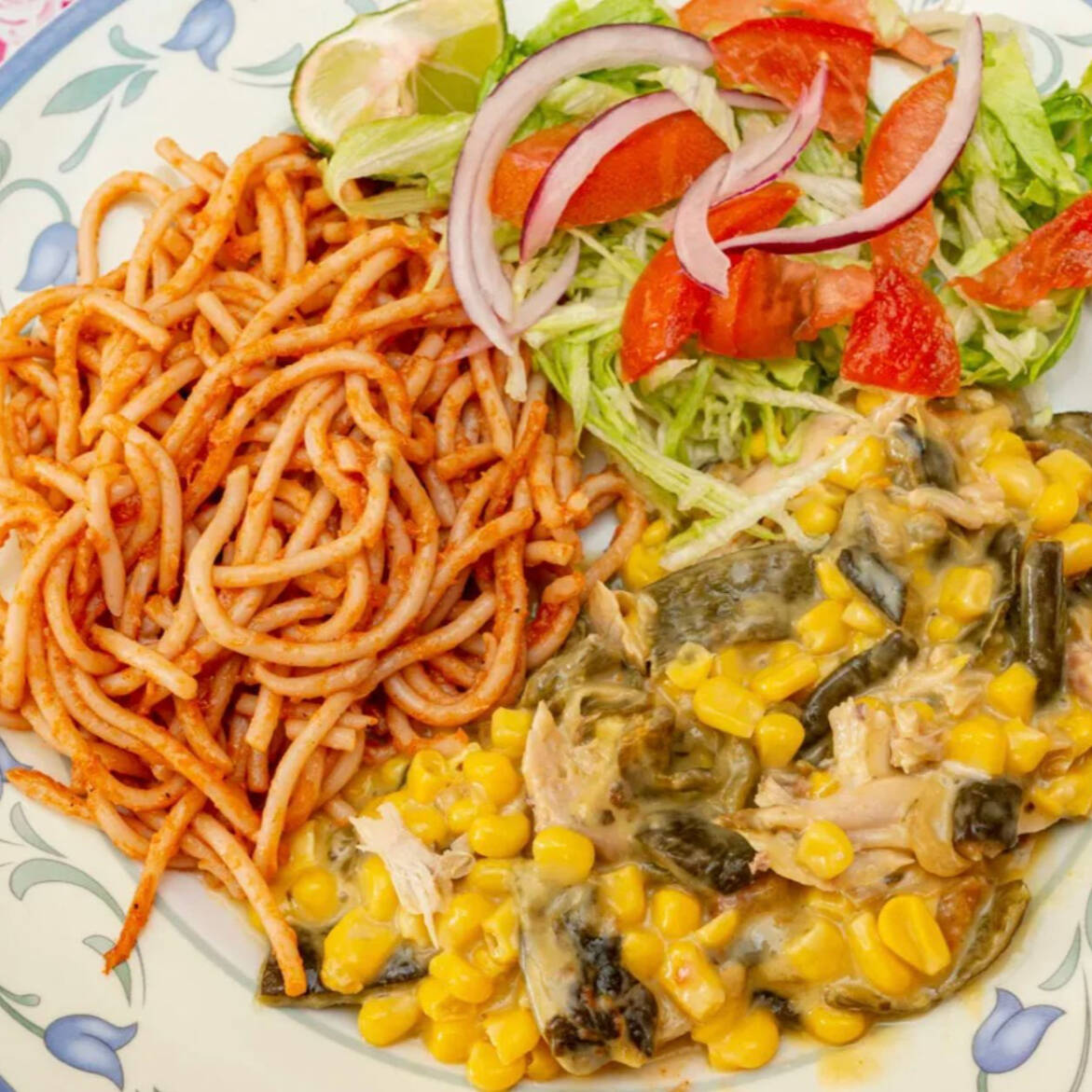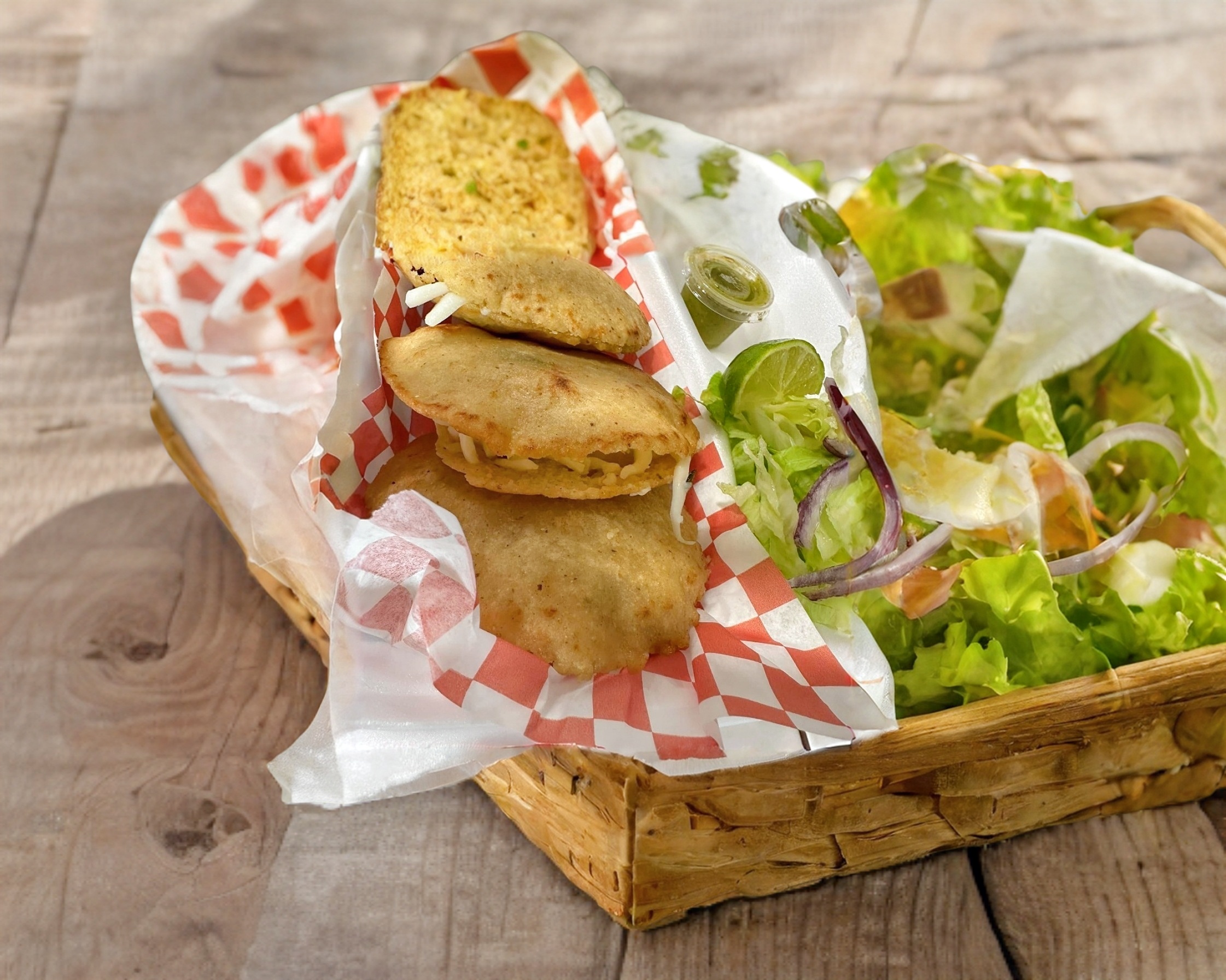 3 tortitas de papa arroz o spaguietti (especificar), frijoles, ensalada de lechuga y tomate.