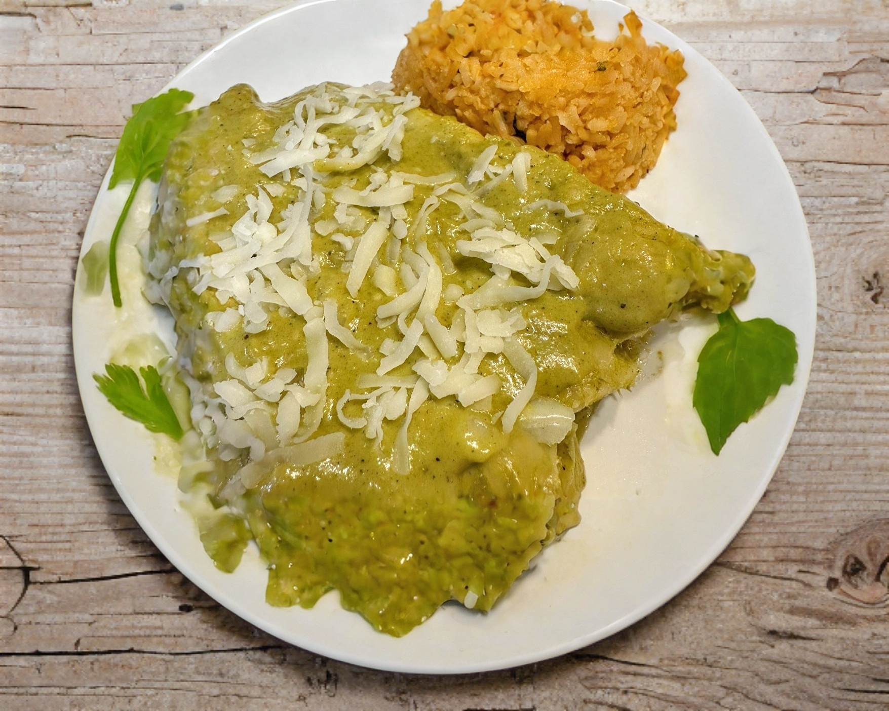 4 Enchiladas, arroz, frijoles, ensalada de lechuga y tomate.