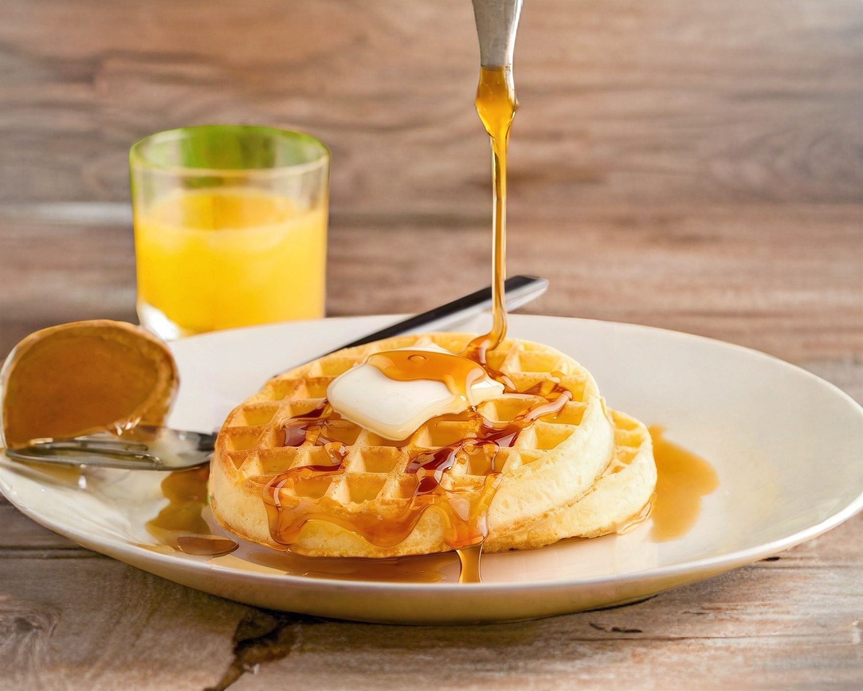 1 mini wafle, miel, chocolate liquido