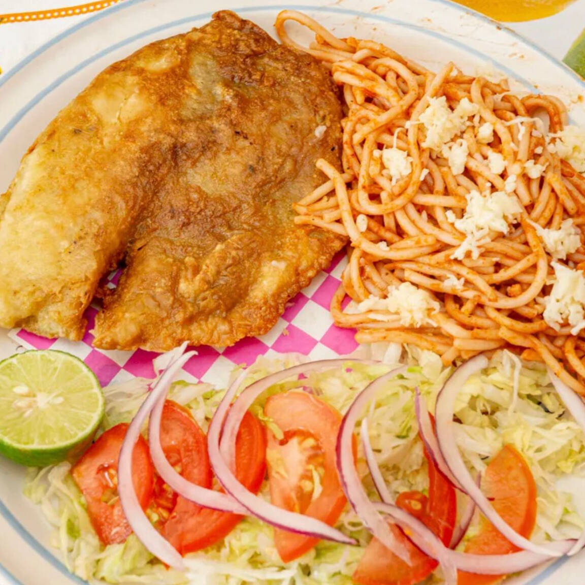 1 Filete arroz o spaguetti (especificar), ensalada de lechuga y tomate.