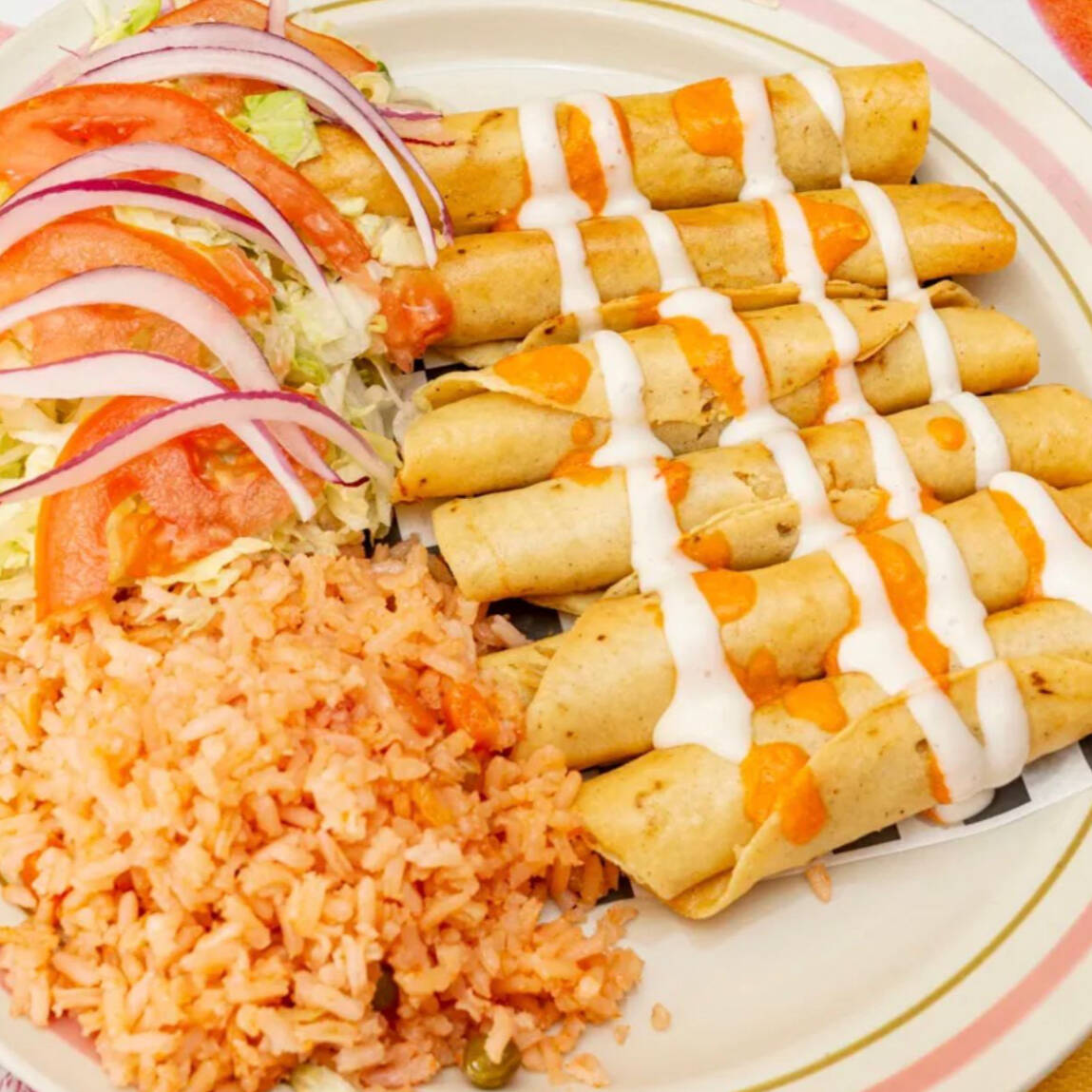 6 tacos dorados surtidos arroz o spaguetti (especificar), ensalada de lechuga y tomate.