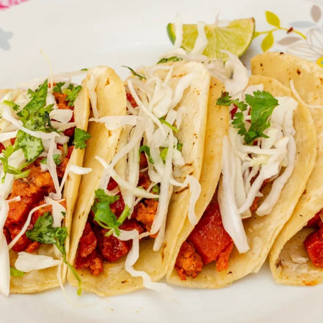 4 tacos de discada, verdura, limon, salsa