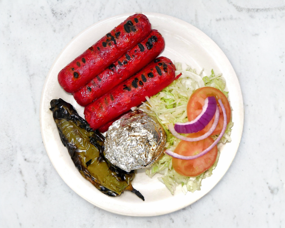 Dos salchichas asadas a la parrilla, acompañadas de cebolla asada, chilaca, tortillas, ensalada y salsa.