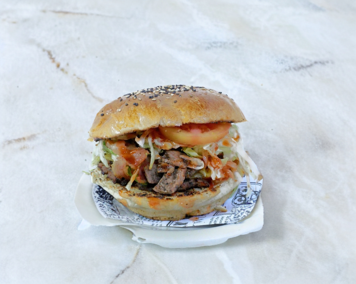 Carne a la parrilla 100% de res Calidad Ganaderia Revuelta con queso americano, cebolla con tocino, aguacate, piña, lechuga, tomate, Jalapeños y aderezos.