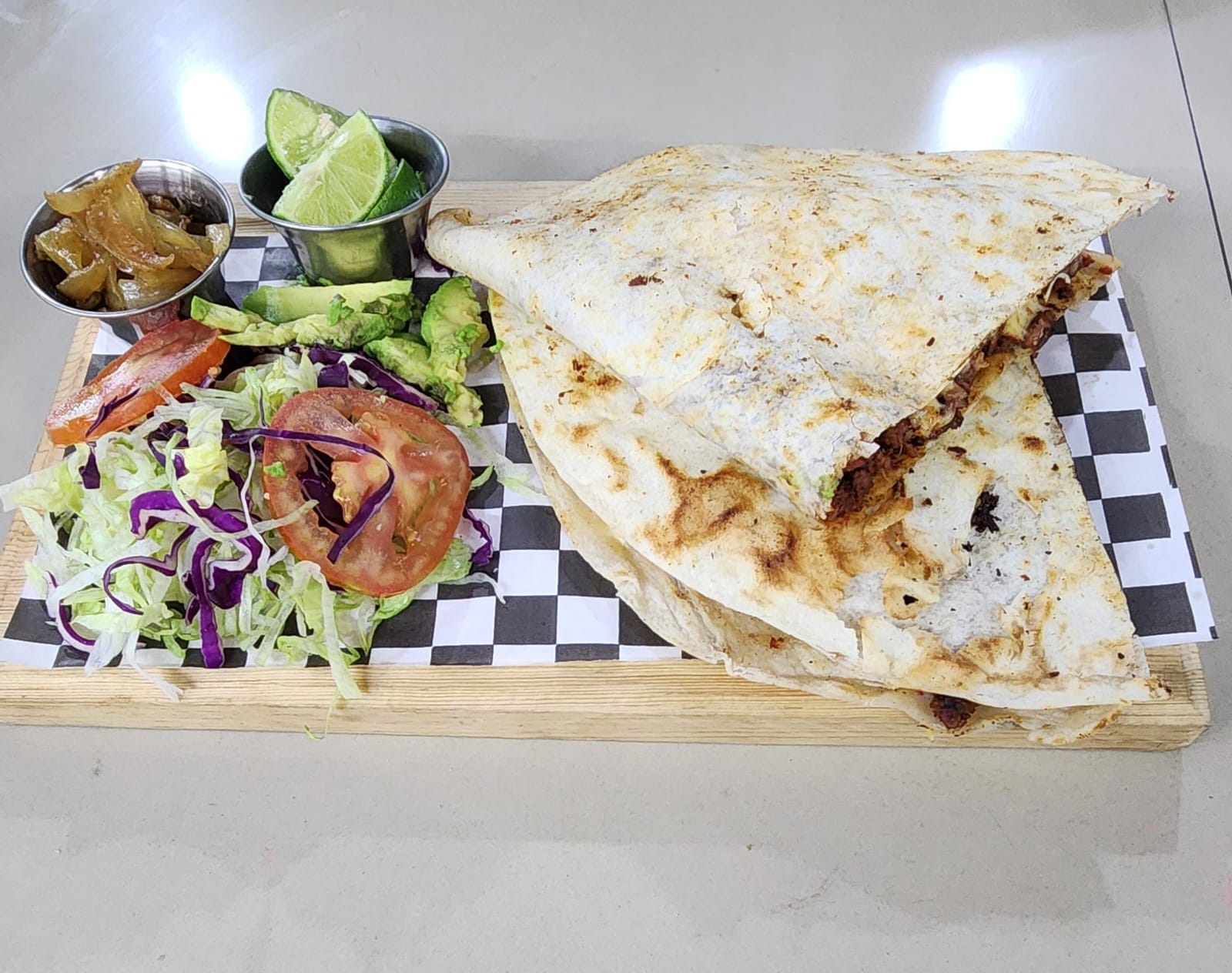Tortilla de harina gigante con deliciosa Carne Asada Calidad Ganaderia Revuelta Gratinada con queso chihuahua, acompañada de ensalada Fresca y salsas.