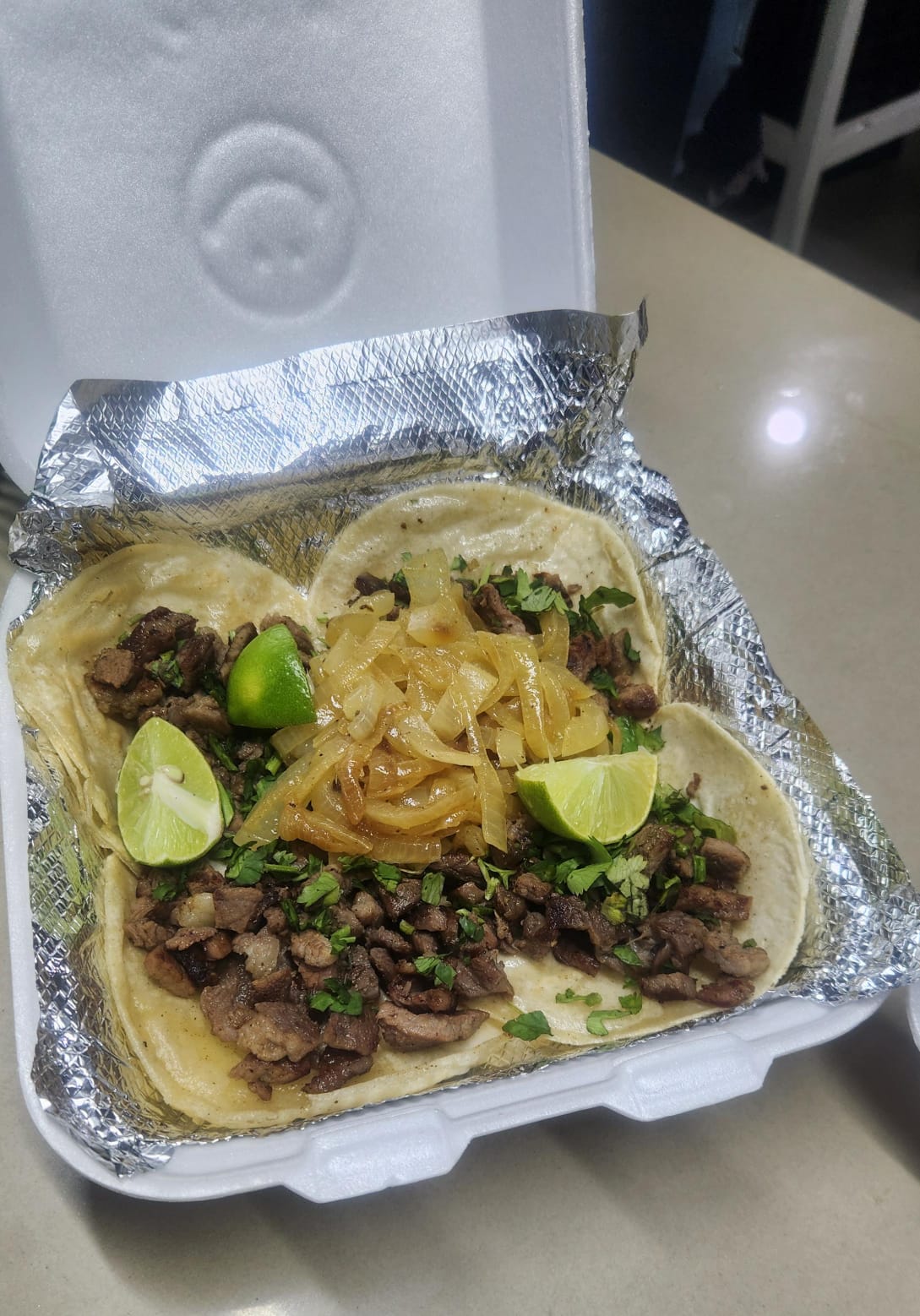 Carne jugosa servida en tortillas, acompañada de cebolla asada,cilantro y salsas.