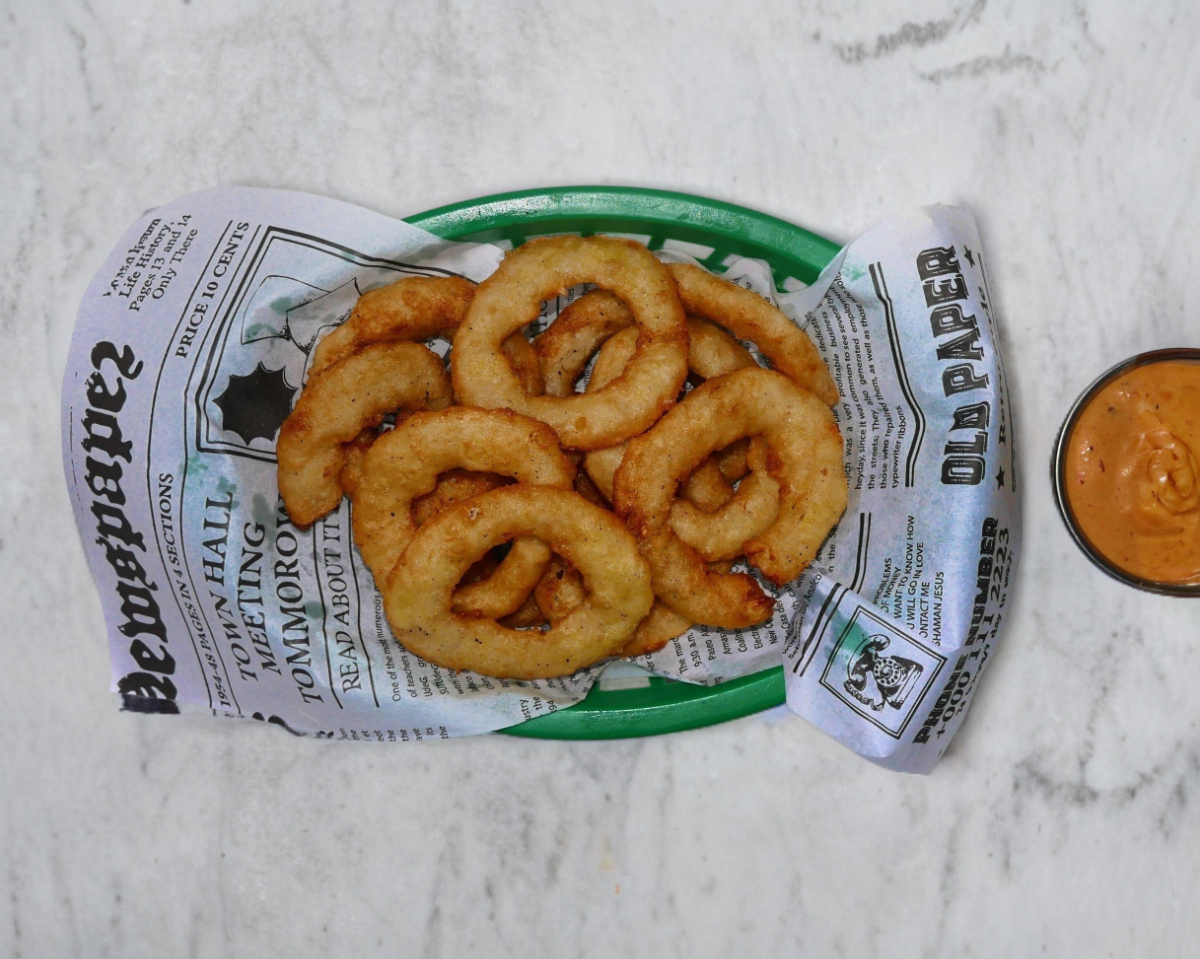 Orden de aros de cebolla 12 crujientes piezas, incluye aderezos chiplomayo y creamy jalapeño.