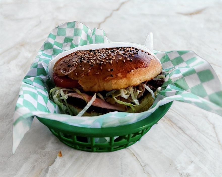 Carne a la parrilla 100% de res Calidad Ganaderia Revuelta, con queso americano, jamón, cebolla con tocino, lechuga, tomate, Jalapeños y aderezos.