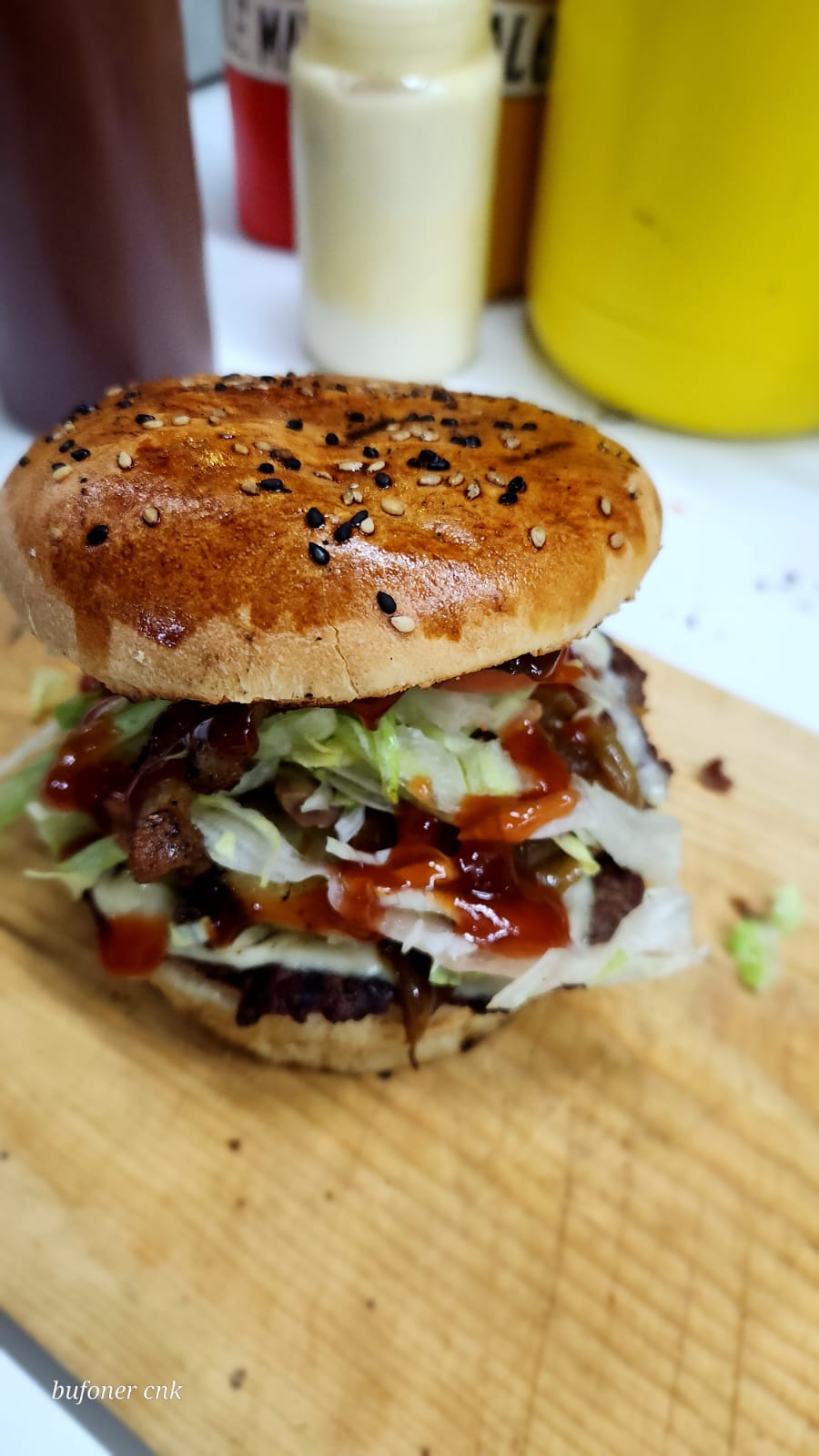 Dos deliciosas carnes doraditas a la plancha, 100% de res calidad Ganaderia Revuelta queso americano, crujientes tiras de tocino , cebolla caramelizada, aderezo de la casa y Jalapeños..