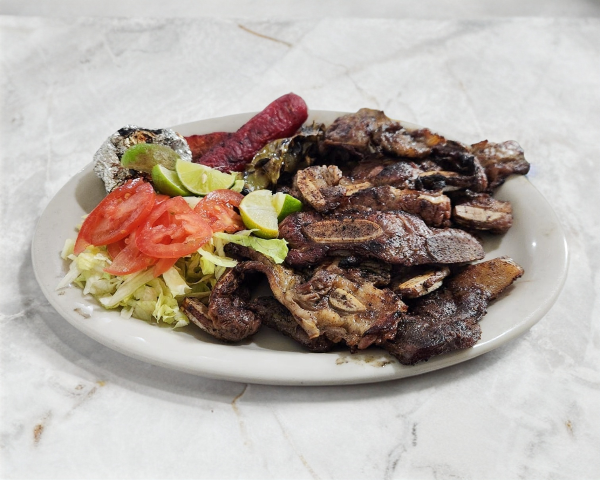 Jugosa carne sin hueso, calidad Ganaderia Revuelta incluye media salchicha para asar, cebolla asada, chilaca, tortillas, frijoles charros, ensalada y salsas.